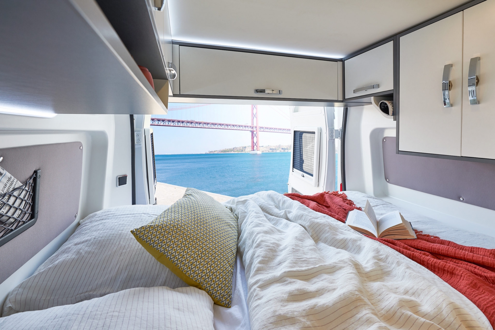 - Okno otwierane u góry o wymiarach 560 x 465 mm z roletą zaciemniającą i moskitierą
