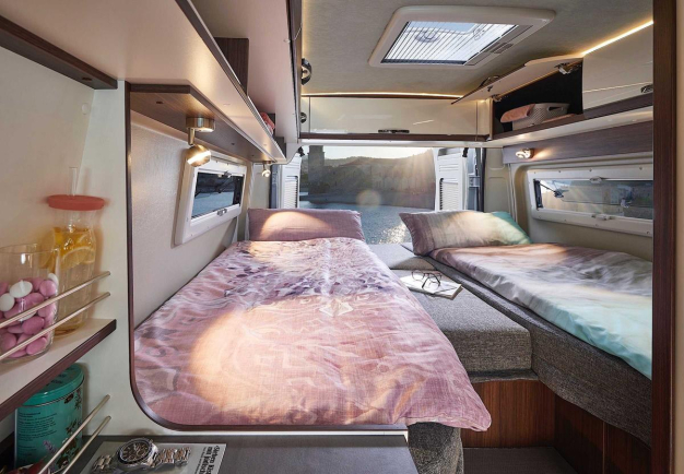 - Wyjątkowa koncepcja przestrzenna na otwartym planie z dużą ilością miejsca nad głową i na nogi, jak w kamperze zintegrowanym.