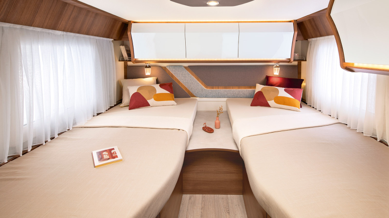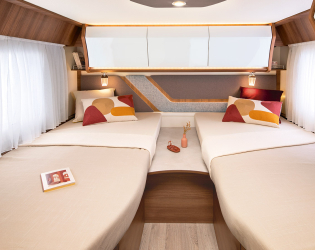 - Bez łóżka nad kabiną, z teleskopową nogą stołu w salonie umożliwiającą stworzenie miejsca do spania - opcja