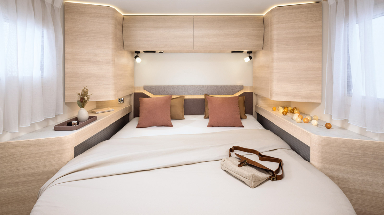 - Bez łóżka nad kabiną, z teleskopową nogą stołu w salonie umożliwiającą stworzenie miejsca do spania - opcja