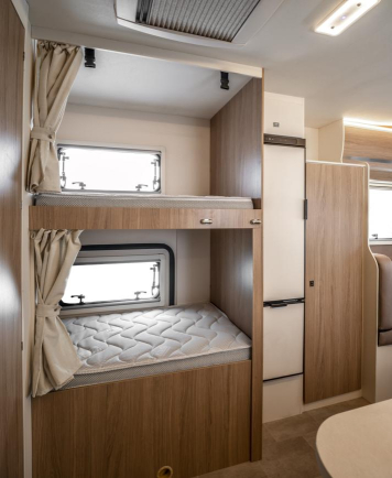 Dostępne są dwie wersje z zabudową o długości poniżej 7 metrów – zaskakująca Evo Sound z 6 homologowanymi siedzeniami i 7 łóżkami oraz Evo 5 z największym garażem w swojej kategorii. Jest też wyjątkowy w swojej klasie Evo 77 Plus z podwójną jadalnią i podwójnym opuszczanym łóżkiem. Evo 69 Plus ma centralne łóżko, takie jak to, które masz w domu, a Evo 95 Plus ma podwójne łóżka, które można przekształcić w przestronne łóżko typu king-size.