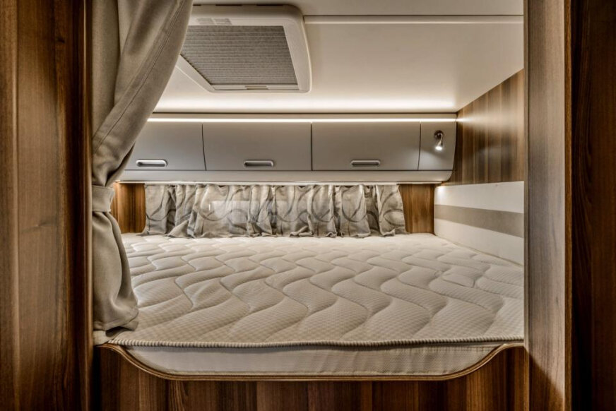 Inne cechy: przednie opuszczane łóżko w standardzie we wszystkich modelach niskoprofilowych, ogrzewanie Combi Gas z cyfrową jednostką sterującą CP Plus w standardzie, zakrzywione szafki z zawiasami z amortyzatorami, podwyższona wysokość wnętrza pod opuszczanym łóżkiem (192 cm), łóżko w alkowie z pneumatycznymi stelażami.