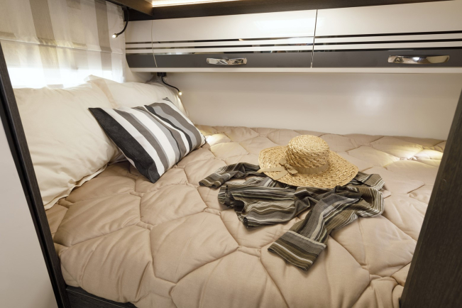 Różne układy części sypialnej, z łóżkami pojedynczymi, łóżkami typu queen-size, łóżkami piętrowymi lub łóżkami poprzecznymi. W serii Kronos każdy komfort snu jest dostępny w standardzie. Duże okna boczne i świetliki dachowe zapewniają światło i wentylację. Dla większych załóg dostępne są łóżka opuszczane lub łóżka, które można stworzyć po przekształceniu salonu.