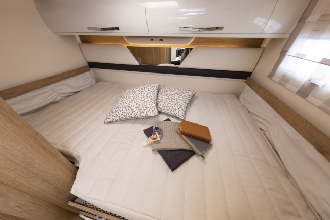 - Półki, schowki i zamykane szafki wokół kabiny w modelach półzintegrowanych