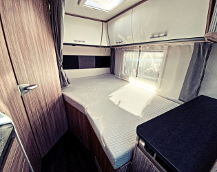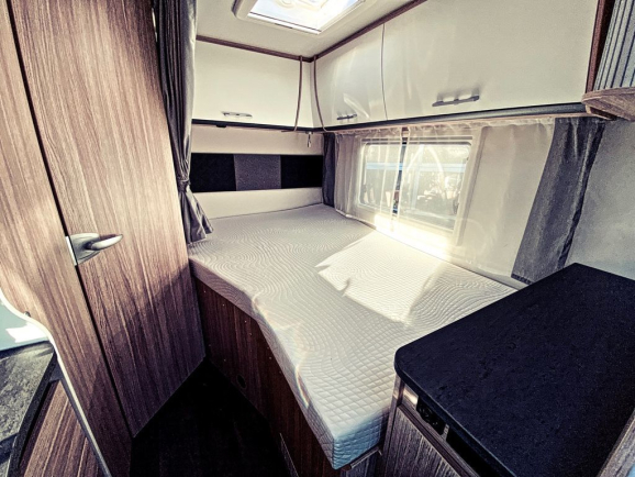 - Wysuwane łóżko w alkowie dla lepszego dostępu do kabiny (w przypadku zamówienia opcjonalnej przebudowy części wypoczynkowej w zintegrowanej jednostce wejście do łóżka jest przez boczną kanapę)
