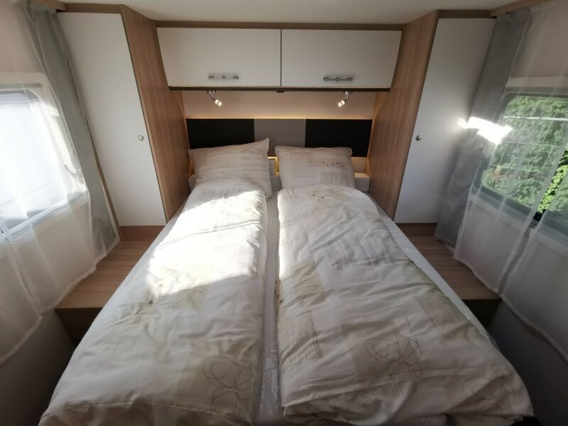 - Alkowa z oknem bocznym po prawej stronie, dyszami gorącego powietrza, nad głową 72 cm i łóżkiem o wymiarach 210 × 160 cm