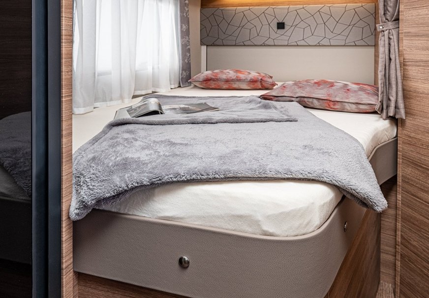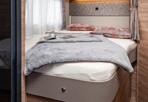 Raj do zabawy za dnia, raj do snu w nocy: składane łóżko można schować pod wysokim dachem w kilku prostych krokach. Oznacza to, że przestrzeń pod spodem jest przez cały czas doskonale nadająca się do użytku - a jednocześnie możesz cieszyć się wygodną wysokością stania i dużą ilością miejsca nad głową. Półzintegrowany pojazd może być tak elastyczny!