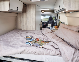 - Pakiet Elektryczny LED: linie świetlne LED w schowku dachowym i dodatkowe gniazdka 12 V / 230 V w obszarze kanapy, linia świetlna LED nad drzwiami przesuwnymi (w zestawie ściemniacz i pilot)