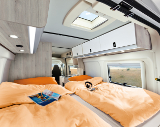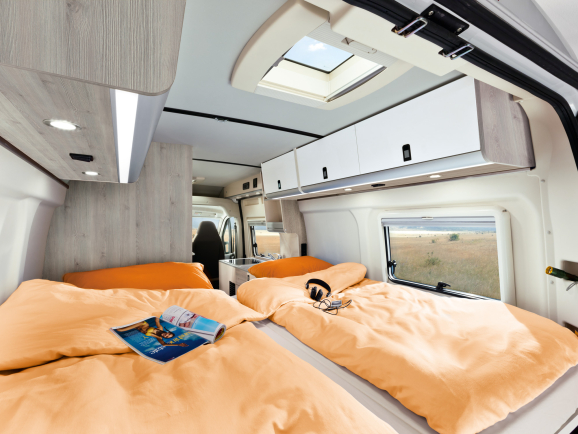 - Pakiet Elektryczny LED: linie świetlne LED w schowku dachowym i dodatkowe gniazdka 12 V / 230 V w obszarze kanapy, linia świetlna LED nad drzwiami przesuwnymi (w zestawie ściemniacz i pilot)