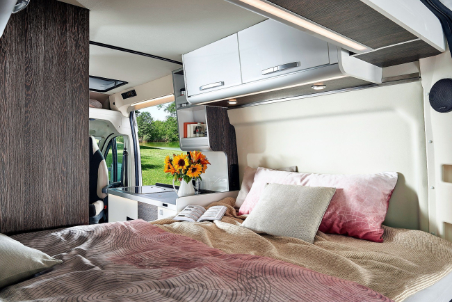- Okładzina dachu i ścian bocznych w obszarze łóżka z wysokiej jakości poszyciem welurowym izolującym temperaturę i akustykę