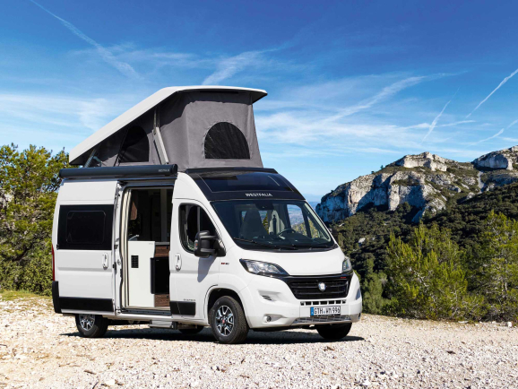 - Dach podnoszony lakierowany w kolorze nadwozia, z wygodnym podwójnym łóżkiem z elastycznymi sprężynami z tworzywa sztucznego 2000 x 1350 mm, 2 lampki do czytania LED, drabina, zabezpieczenie przed upadkiem, całkowita wysokość pojazdu 2,70 m (nie dla Columbus 641 E)