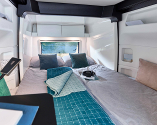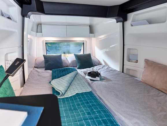 - Wygodne podłużne tylne łóżko Slide-Out (wysuwane), 1,700 / 1,420 x 2,070 mm, wygodne materace z zimnej pianki z tkaniną siatkową, oddychający pokrowiec i składany stopień
