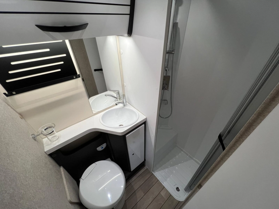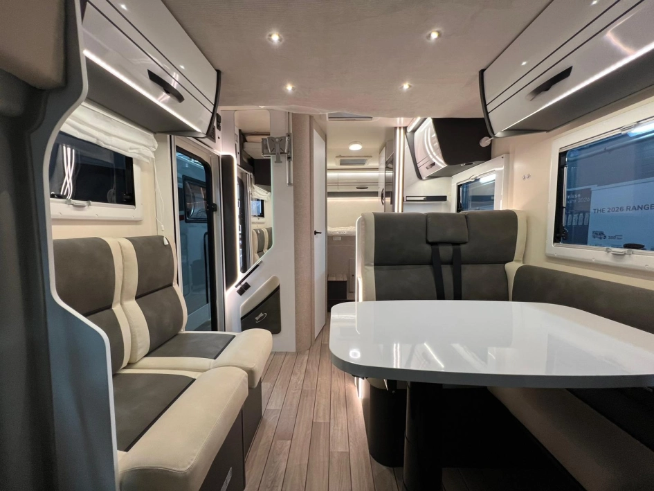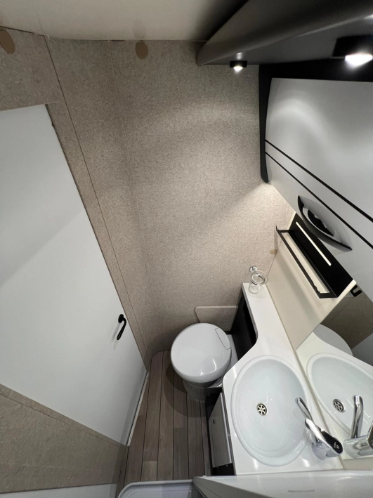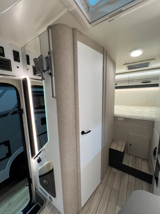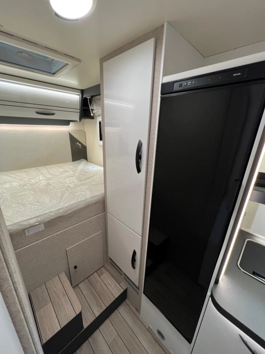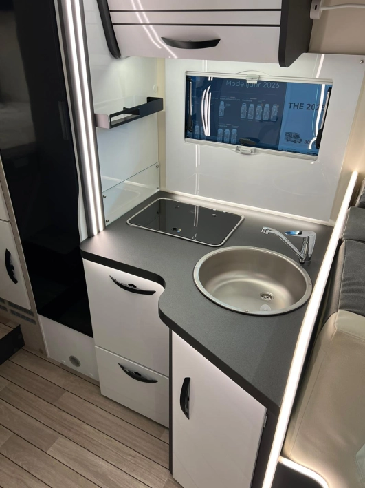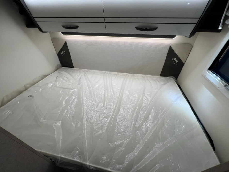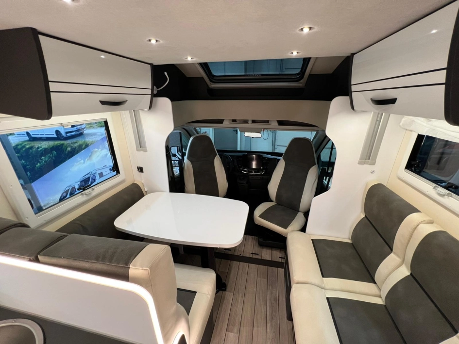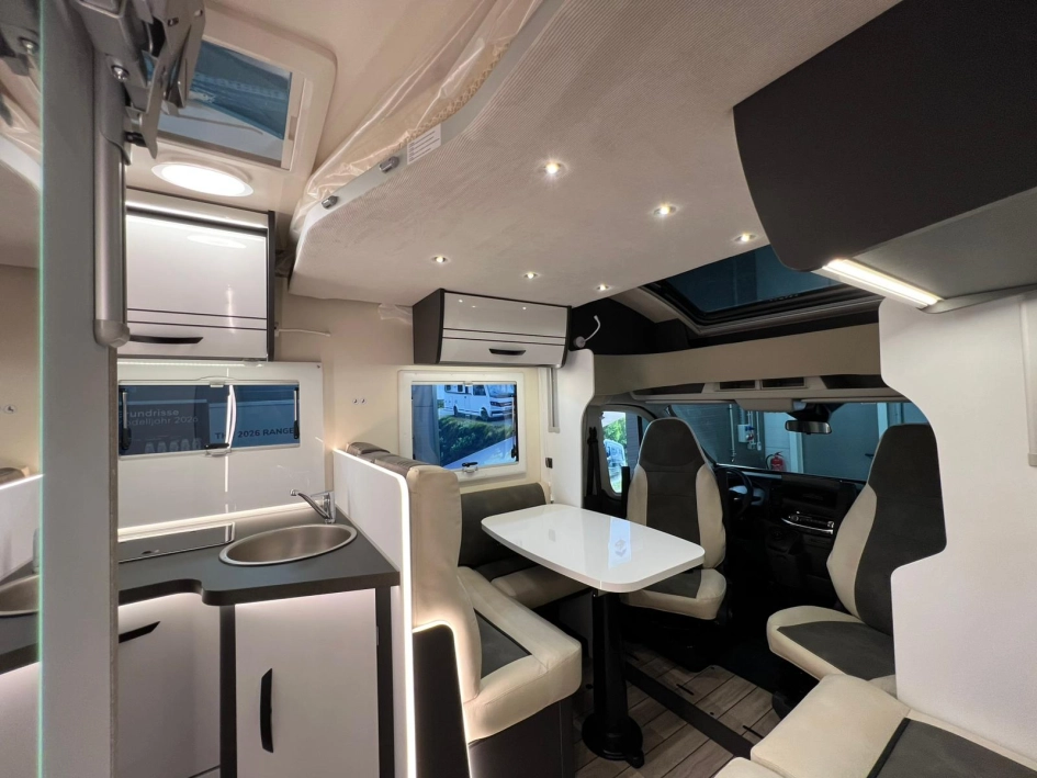 Pięcioosobowy kamper półzintegrowany na podwoziu nowego Forda Transita w klasycznym układzie wnętrza salonu w układzie litery „L”, opuszczanego elektrycznie łóżka nad częścią dzienną dla 2 osób, przestronną kuchnią z licznymi schowkami i dużą zintegrowaną łazienką. Z tyłu pojazdu znajdziemy łóżko poprzeczne o wymiarach 220 cm na 135 cm. Wszystko to otrzymujemy w kamperze do 7 metrów długości. Ten egzemplarz wyróżnia się także bogatym wyposażeniem fabrycznym, do którego zachęcamy do zapoznania się z pozostałym opisem tego modelu.