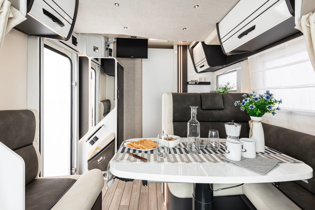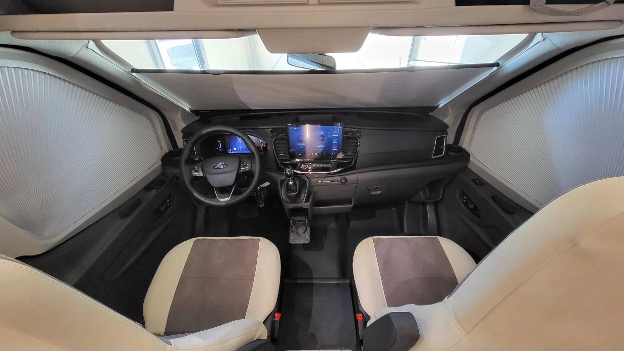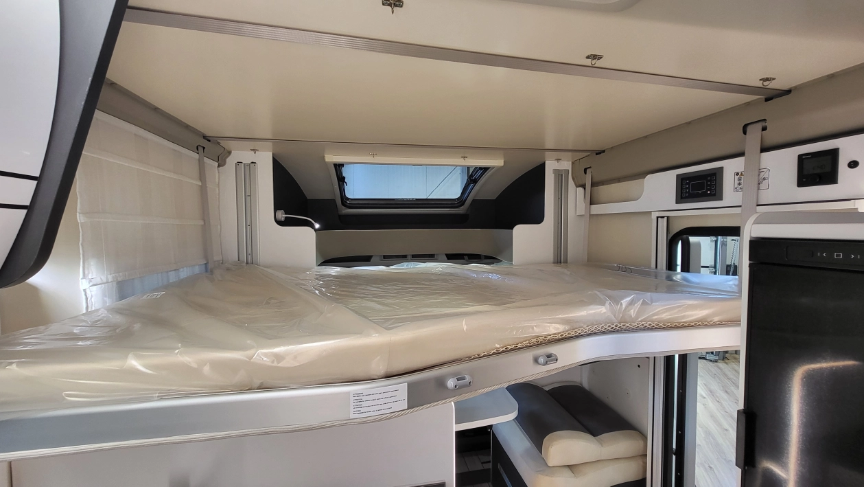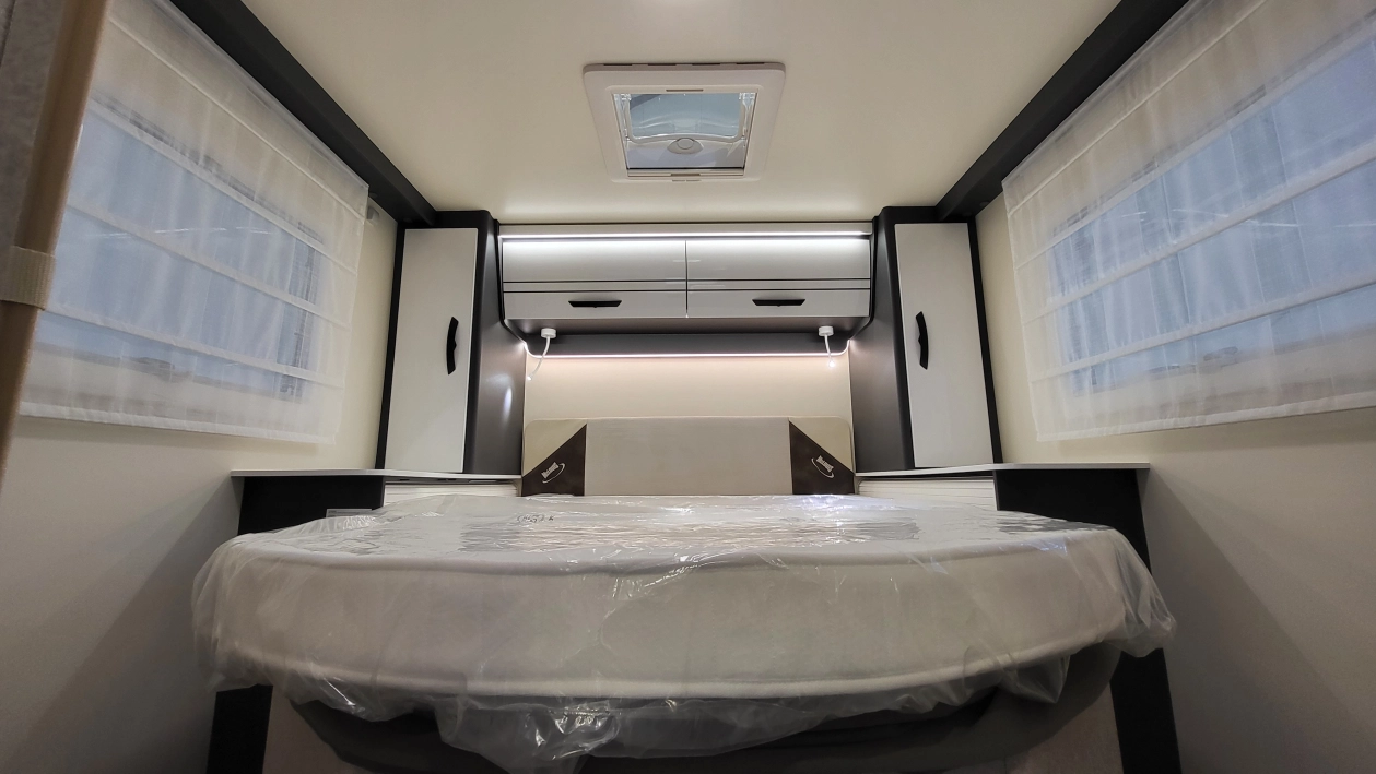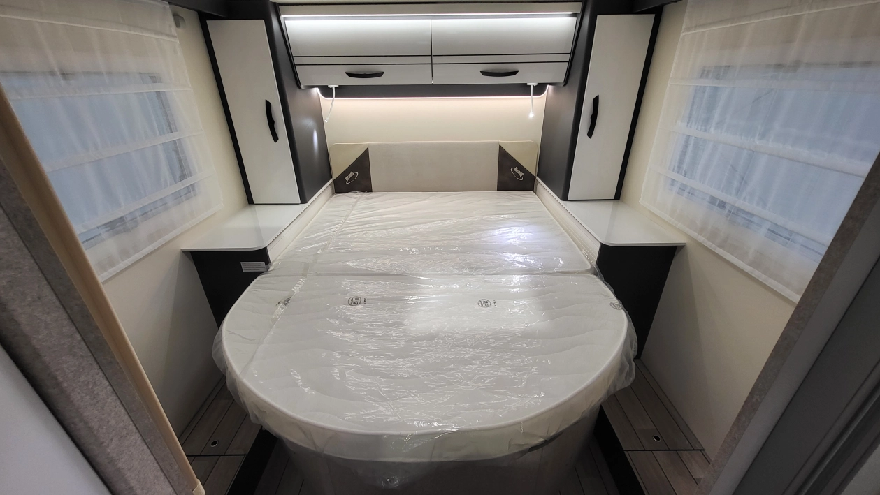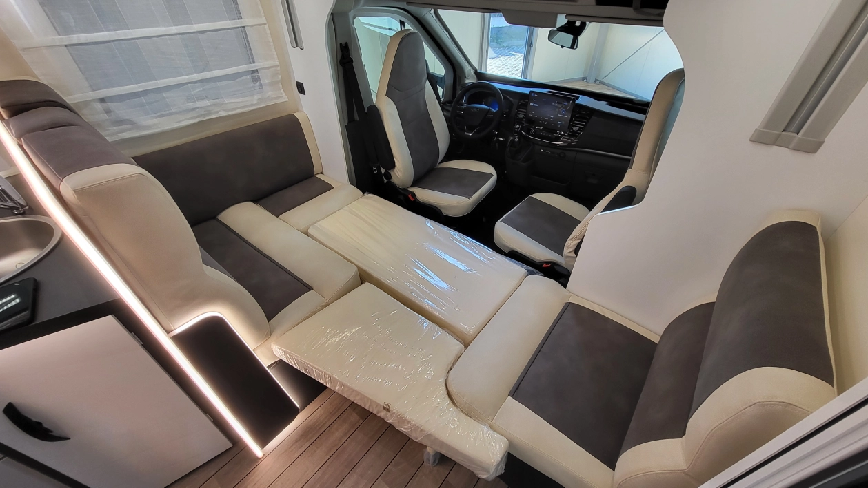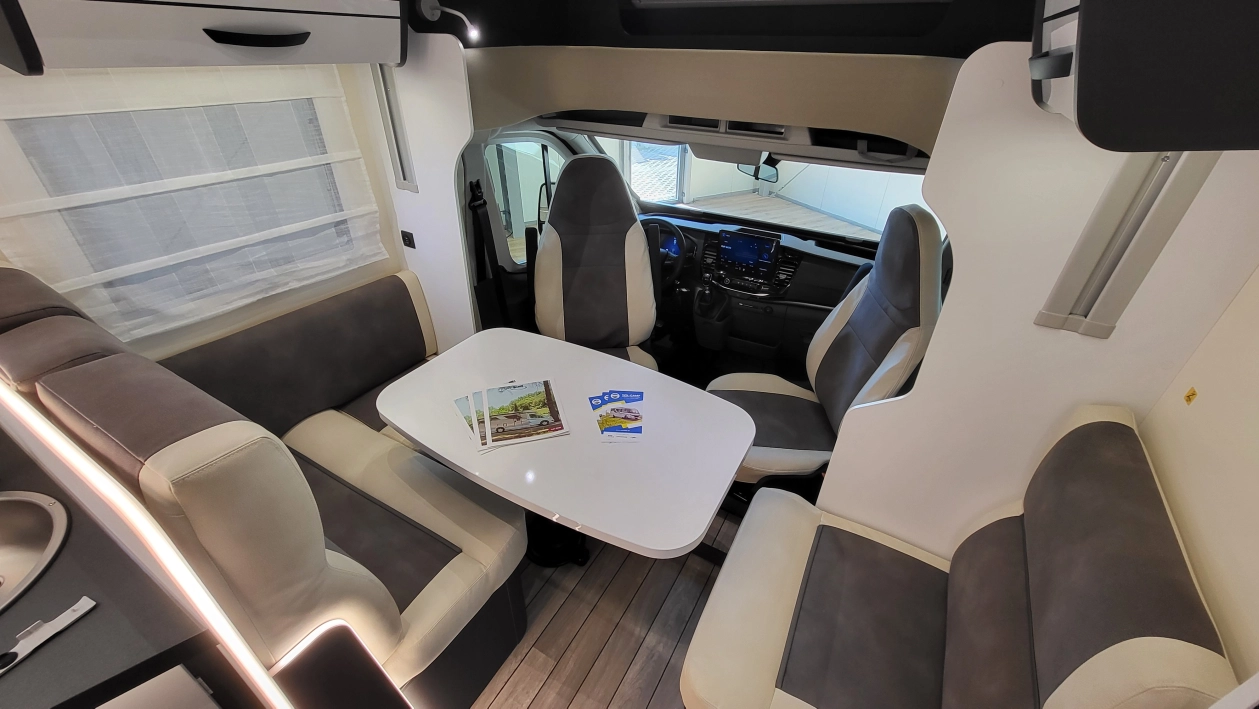 Pięcioosobowa półintegra na podwoziu nowego Forda Transita w klasycznym układzie wnętrza salonu w kształcie litery „L”, opuszczanego elektrycznie łóżka nad częścią dzienną dla 2 osób, przestronną kuchnią z licznymi schowkami, łazienką zamykaną z obu stron, w której kabina prysznicowa jest oddzielna, łóżkiem centralnym, zwanym także jako królewskie, które ma funkcję elektrycznie regulowanej wysokości oraz dużym garażem otwieranym z obu stron.