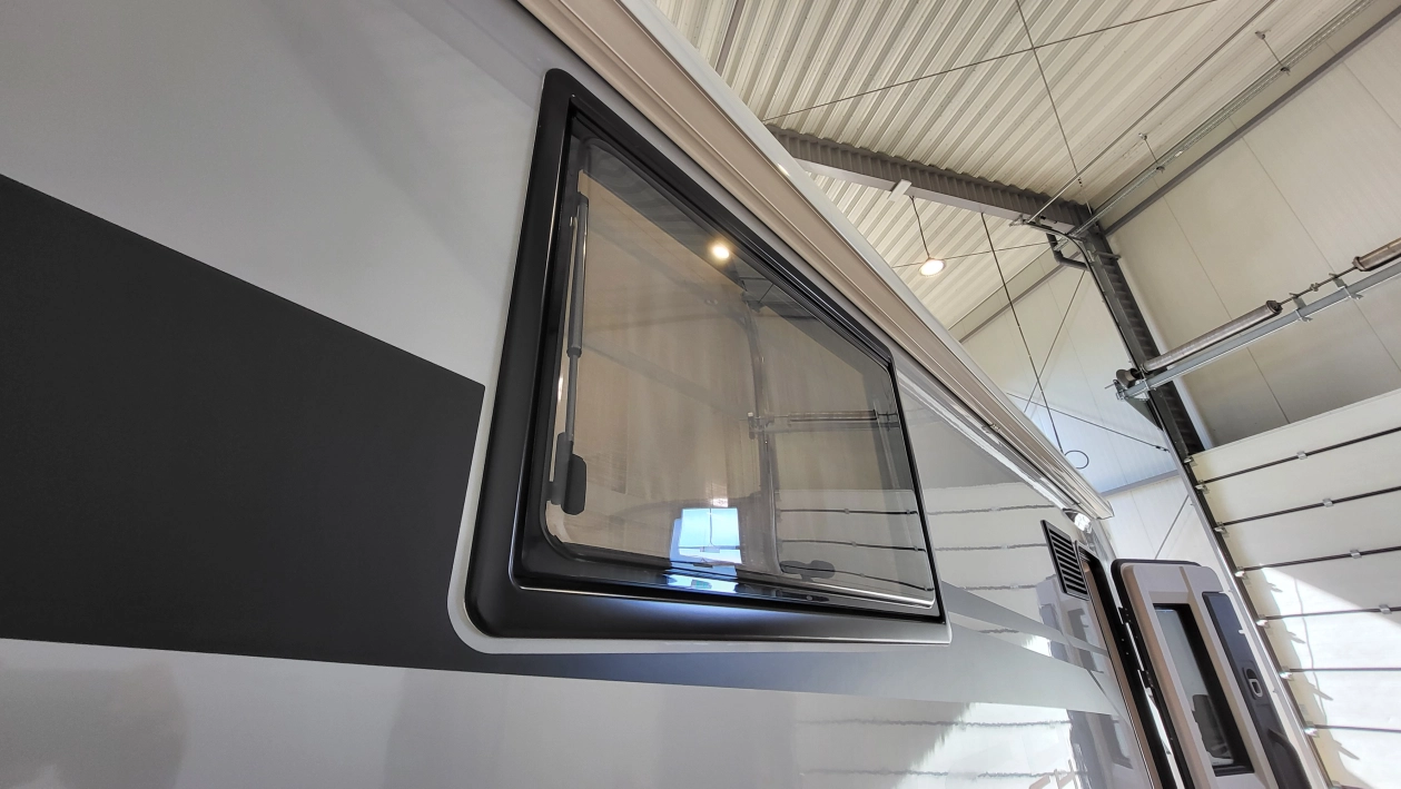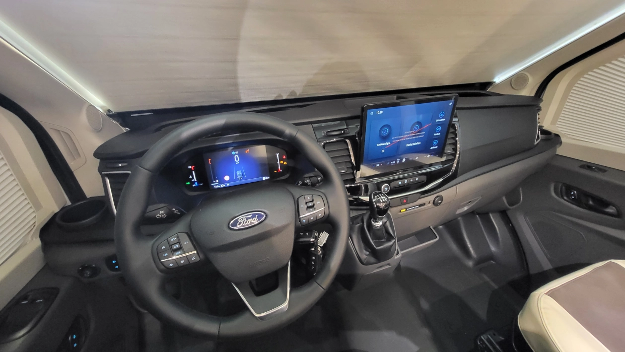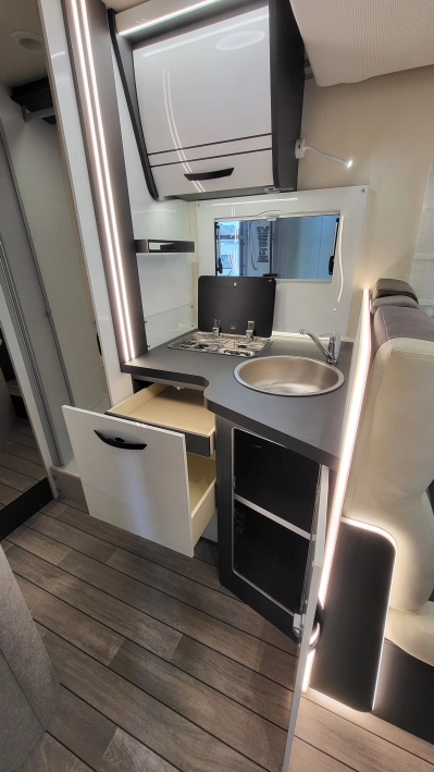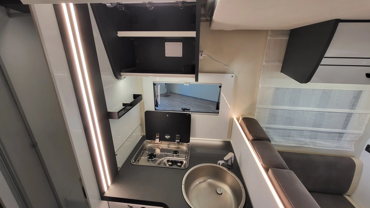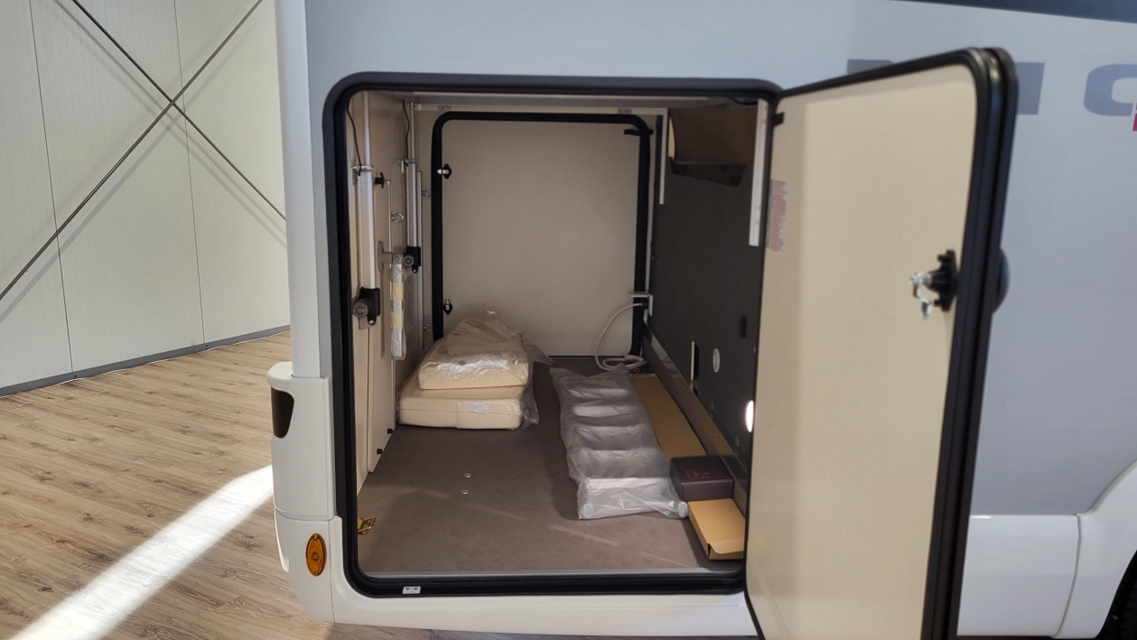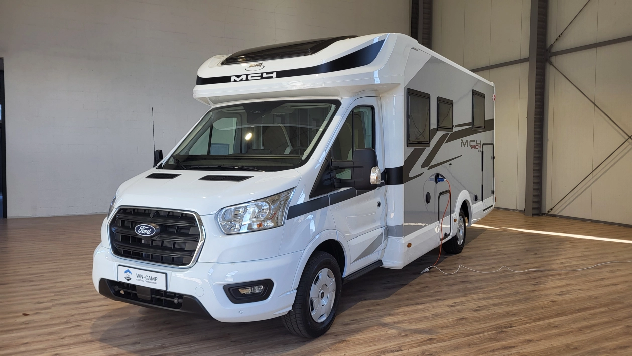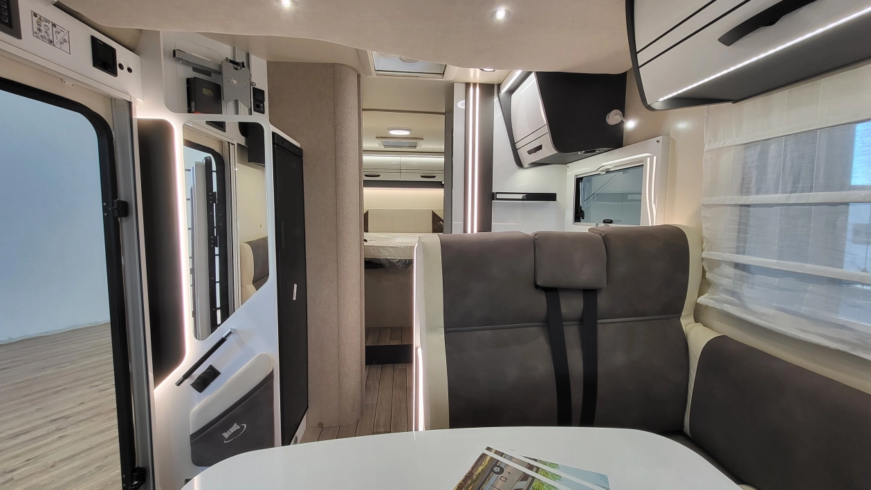 Pięcioosobowa półintegra na podwoziu nowego Forda Transita w klasycznym układzie wnętrza salonu w kształcie litery „L”, opuszczanego elektrycznie łóżka nad częścią dzienną dla 2 osób, przestronną kuchnią z licznymi schowkami, łazienką zamykaną z obu stron, w której kabina prysznicowa jest oddzielna, łóżkiem centralnym, zwanym także jako królewskie, które ma funkcję elektrycznie regulowanej wysokości oraz dużym garażem otwieranym z obu stron.