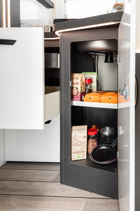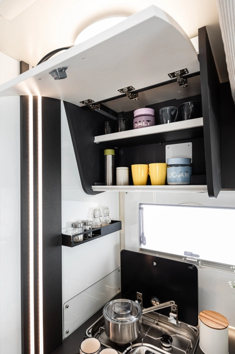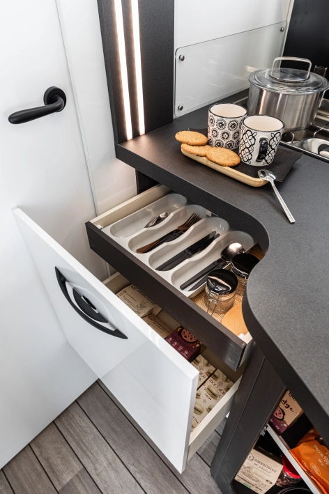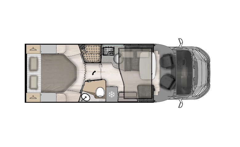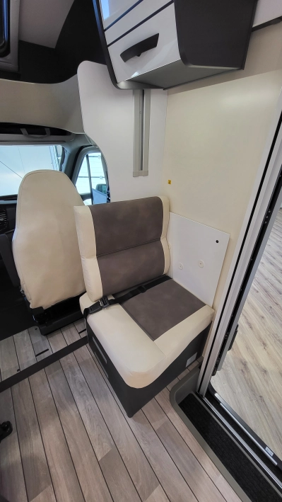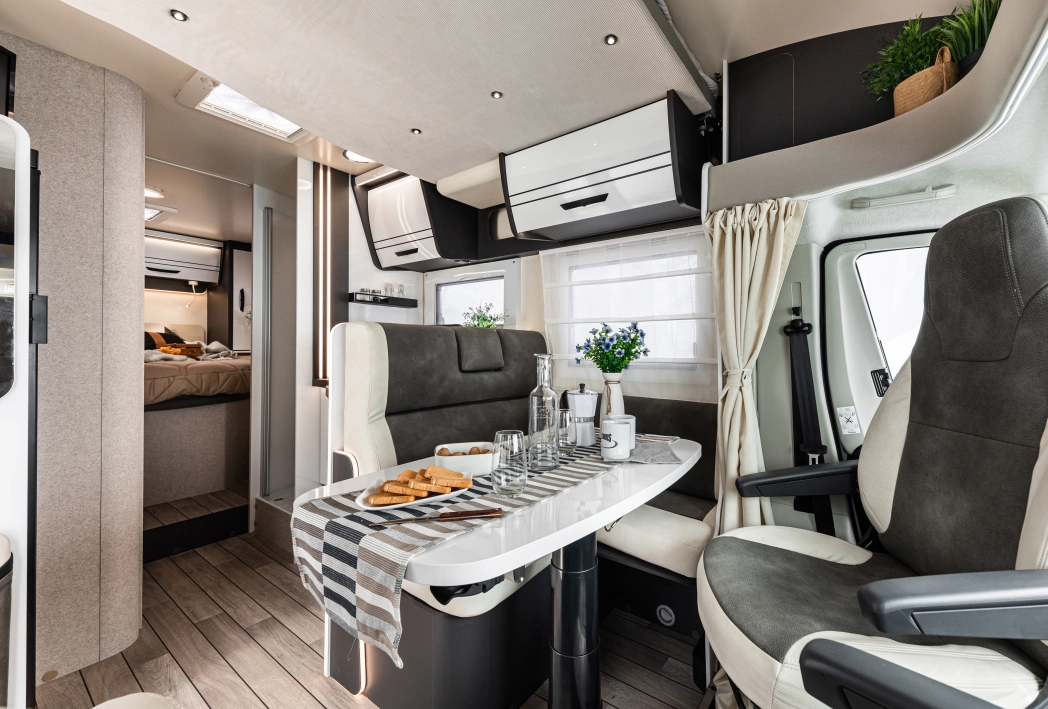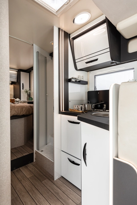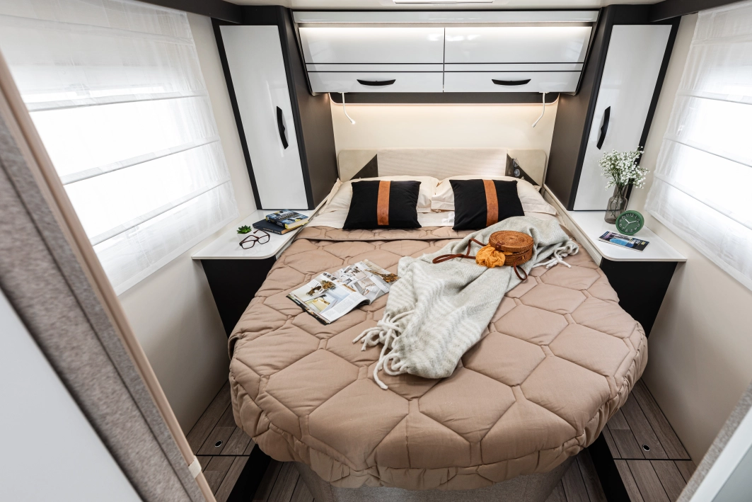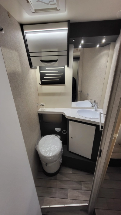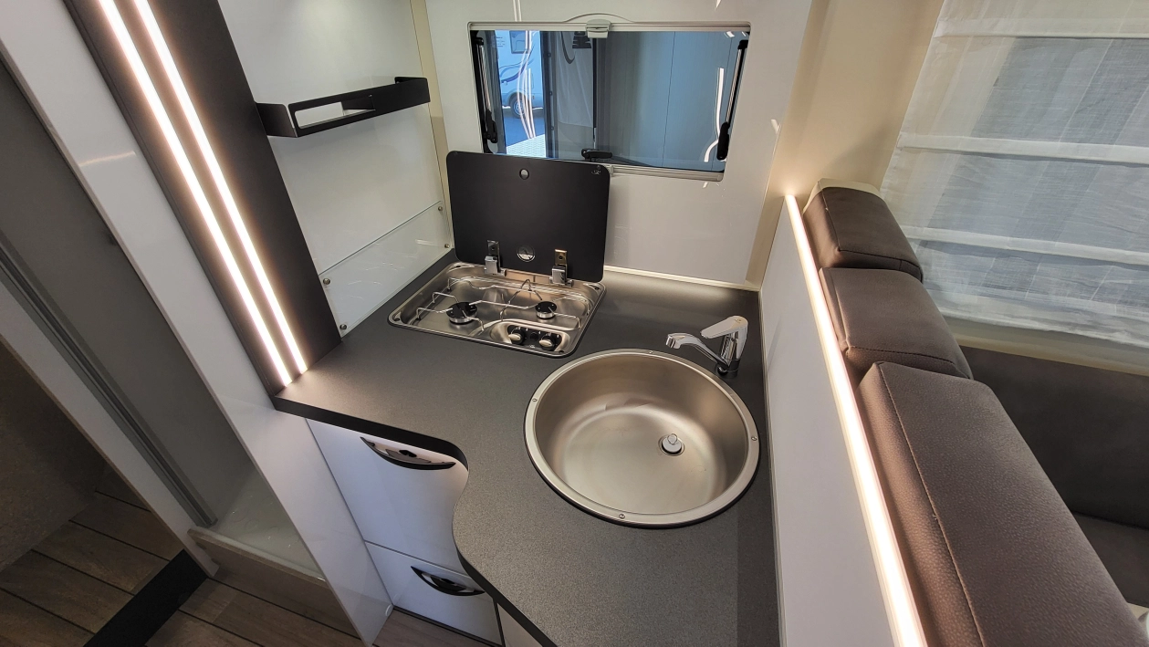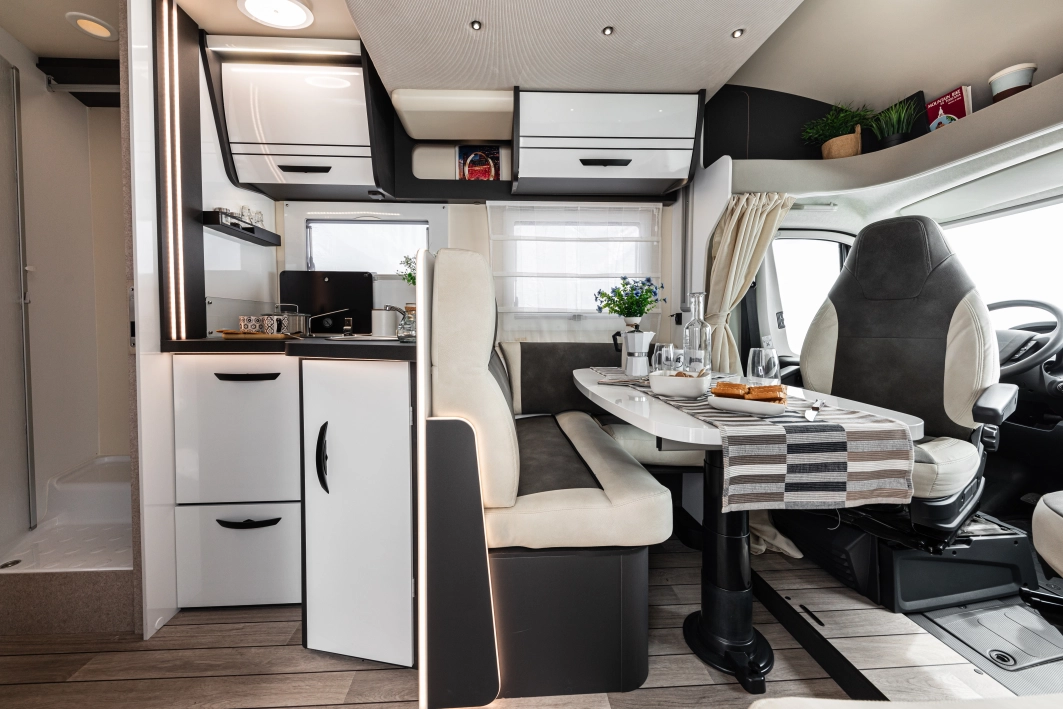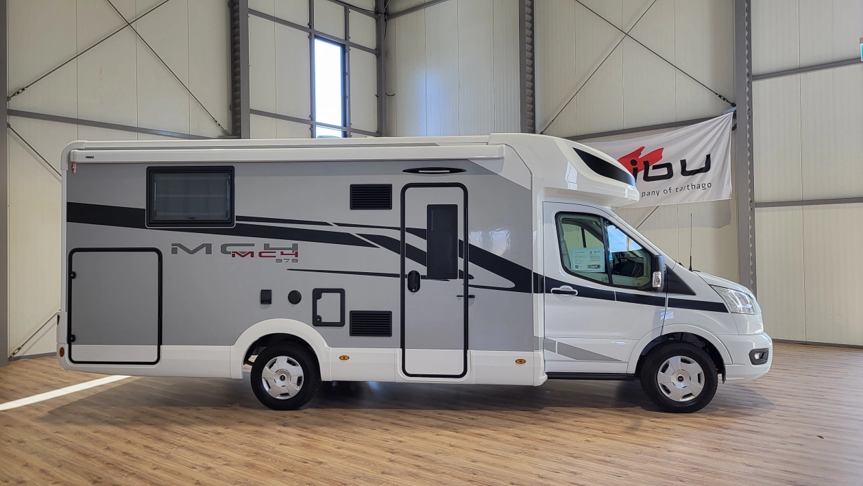 Pięcioosobowa półintegra na podwoziu nowego Forda Transita w klasycznym układzie wnętrza salonu w kształcie litery „L”, opuszczanego elektrycznie łóżka nad częścią dzienną dla 2 osób, przestronną kuchnią z licznymi schowkami, łazienką zamykaną z obu stron, w której kabina prysznicowa jest oddzielna, łóżkiem centralnym, zwanym także jako królewskie, które ma funkcję elektrycznie regulowanej wysokości oraz dużym garażem otwieranym z obu stron.