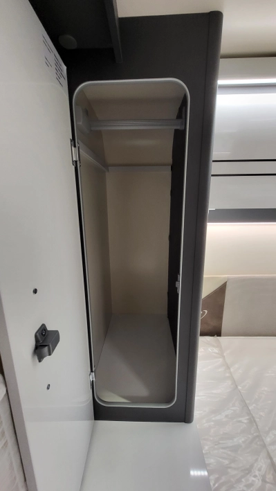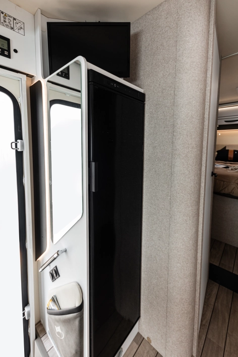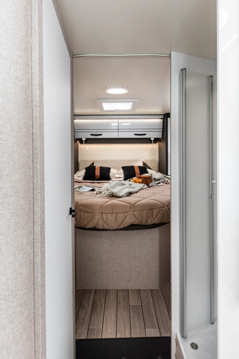 - Plisowana zasłona oddzielająca sypialnię od łazienki na całej wysokości wnętrza kampera