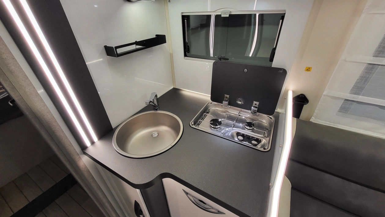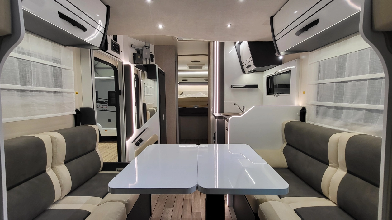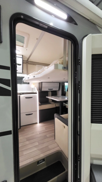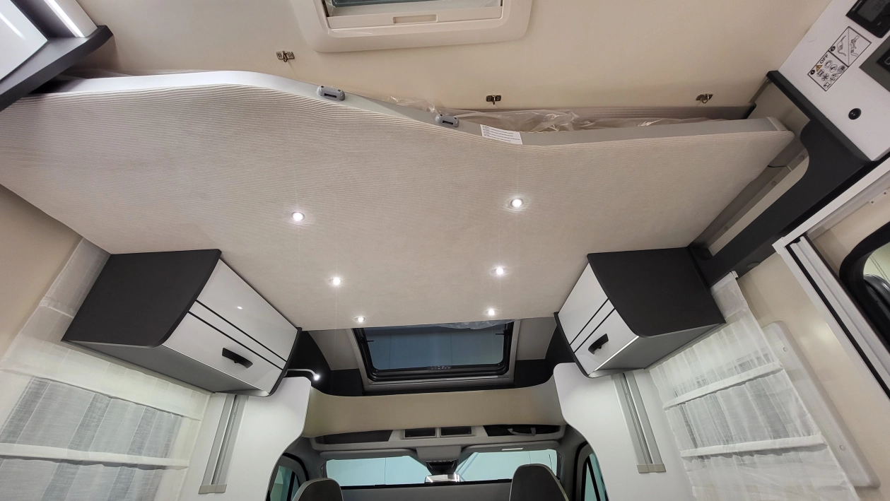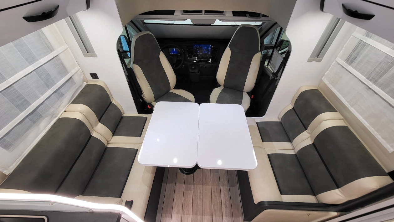 Czteroosobowy kamper półzintegrowany na podwoziu nowego Forda Transita w klasycznym układzie wnętrza dużego salonu w układzie „Face2Face”, opuszczanego elektrycznie łóżka nad częścią dzienną dla 2 osób, przestronną kuchnią z licznymi schowkami, łazienką zamykaną z obu stron, w której kabina prysznicowa jest oddzielna, łóżkiem królewskim zwanym także centralnym i funkcją elektrycznej regulacji góra/dół oraz dużym garażem otwieranym z obu stron. Ten egzemplarz wyróżnia się także bogatym wyposażeniem fabrycznym.
