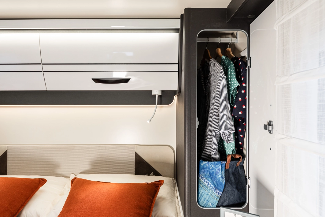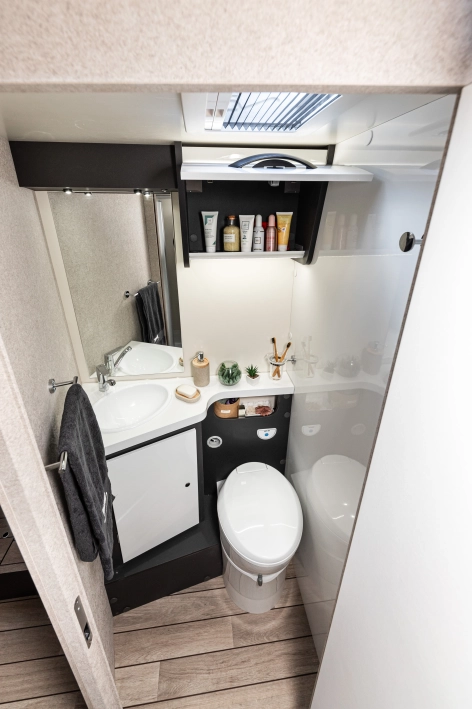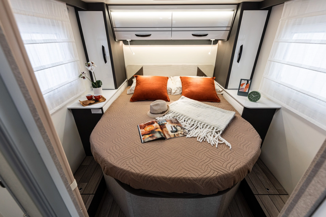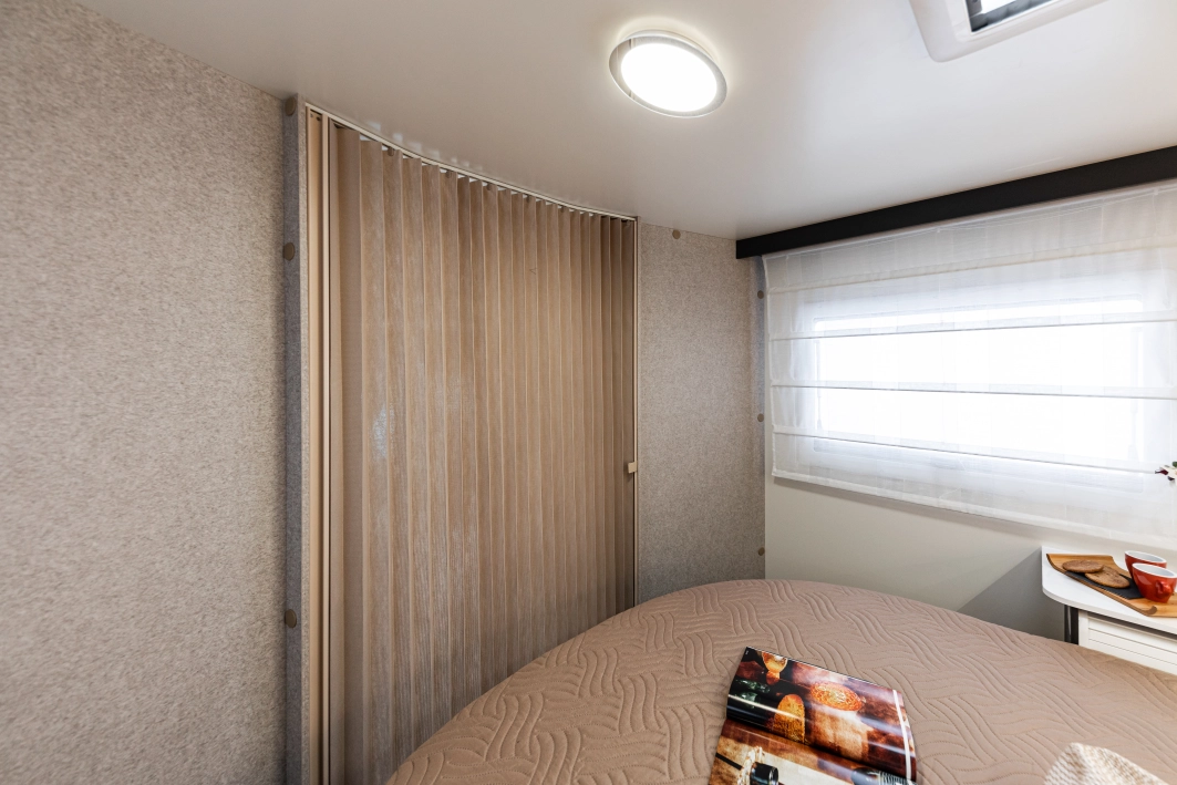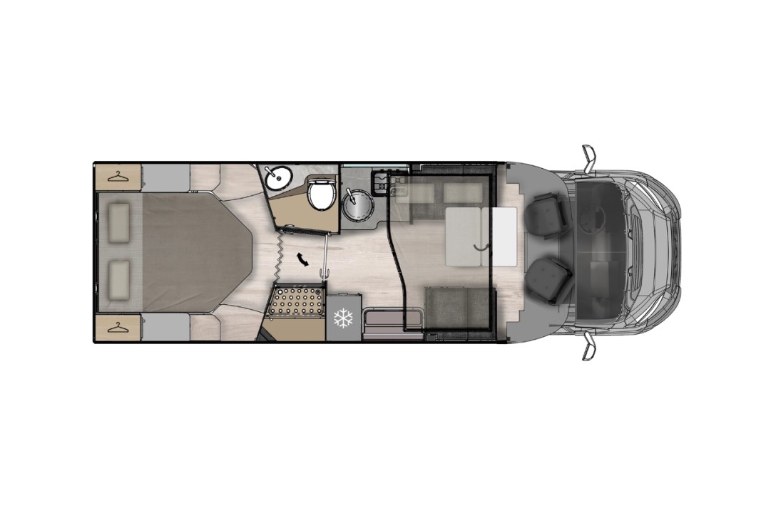 Czteroosobowy kamper półzintegrowany na podwoziu nowego Forda Transita w klasycznym układzie wnętrza dużego salonu w układzie „Face2Face”, opuszczanego elektrycznie łóżka nad częścią dzienną dla 2 osób, przestronną kuchnią z licznymi schowkami, łazienką zamykaną z obu stron, w której kabina prysznicowa jest oddzielna, łóżkiem królewskim zwanym także centralnym i funkcją elektrycznej regulacji góra/dół oraz dużym garażem otwieranym z obu stron. Ten egzemplarz wyróżnia się także bogatym wyposażeniem fabrycznym.
