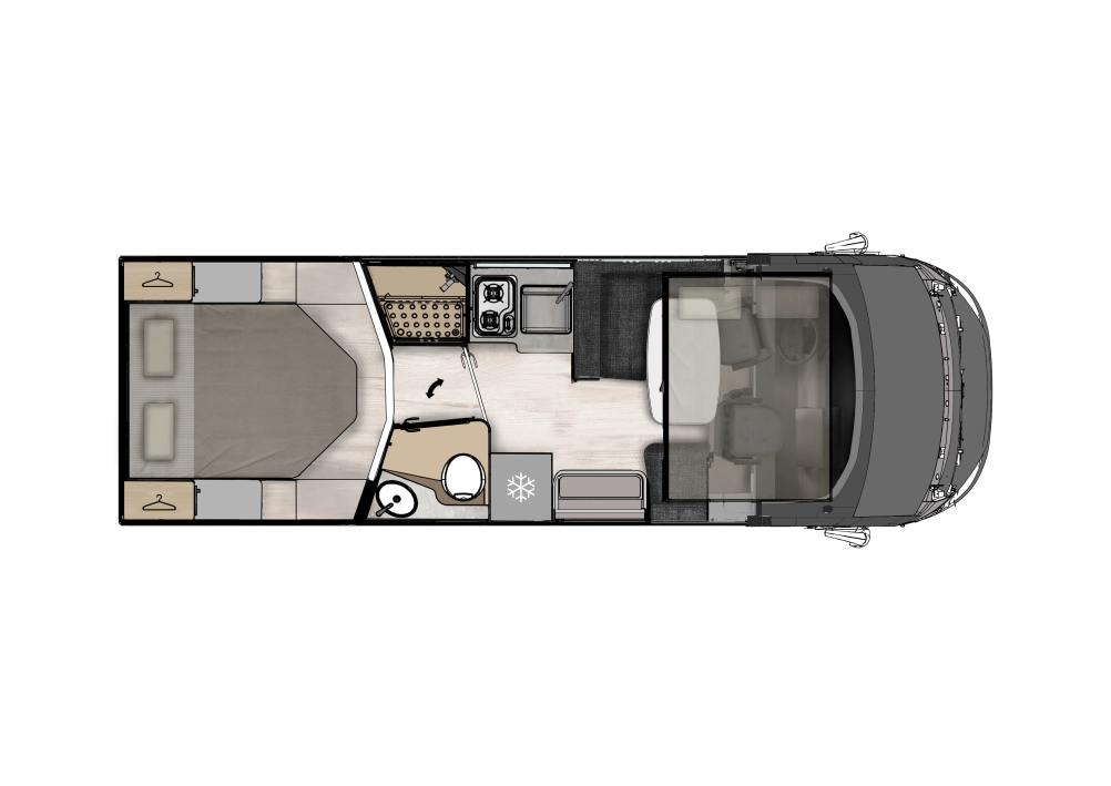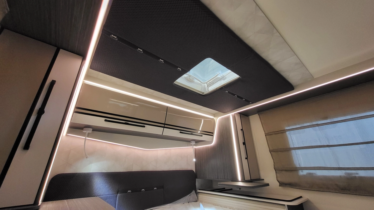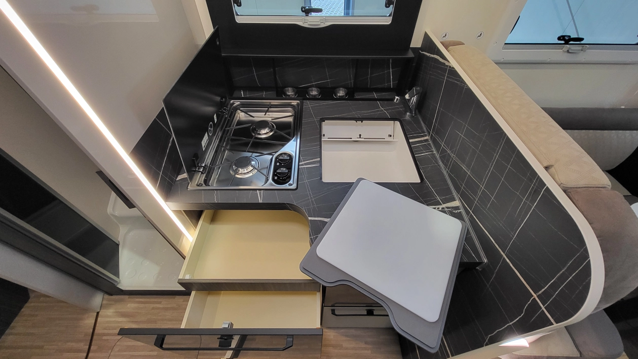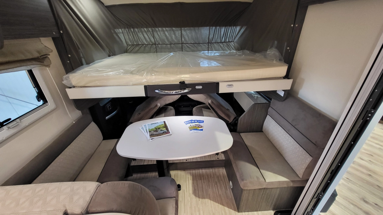 Pięcioosobowy kamper w pełni zintegrowany na podwoziu nowego Fiata Ducato w układzie salonu klasycznej „L”, opuszczanego manualnie łóżka nad szoferką dla 2 osób, przestronną kuchnią z licznymi schowkami i dużą łazienką z pełnowymiarową kabiną prysznicową. Łazienka zamykana jest z obu stron. Z tyłu pojazdu znajduje się układ łóżka centralnego/królewskiego. Wszystko to otrzymujemy w kamperze o długości 7,45 metra. Ten egzemplarz wyróżnia się także bogatym wyposażeniem fabrycznym.