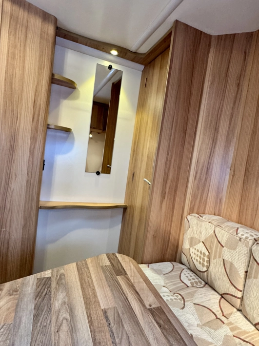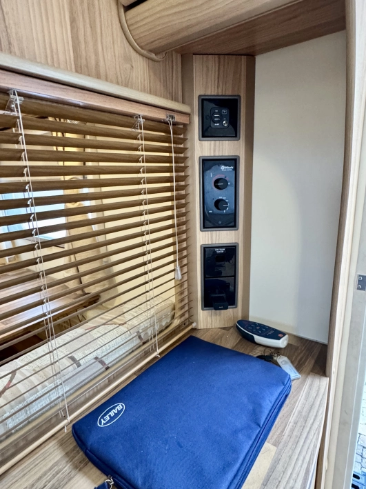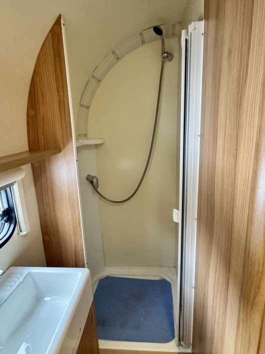 Komfortowe wnętrze z łożem małżeńskim oraz z dużą łazienką z zamykaną kabiną prysznicową oraz wc kasetą #Thetford.