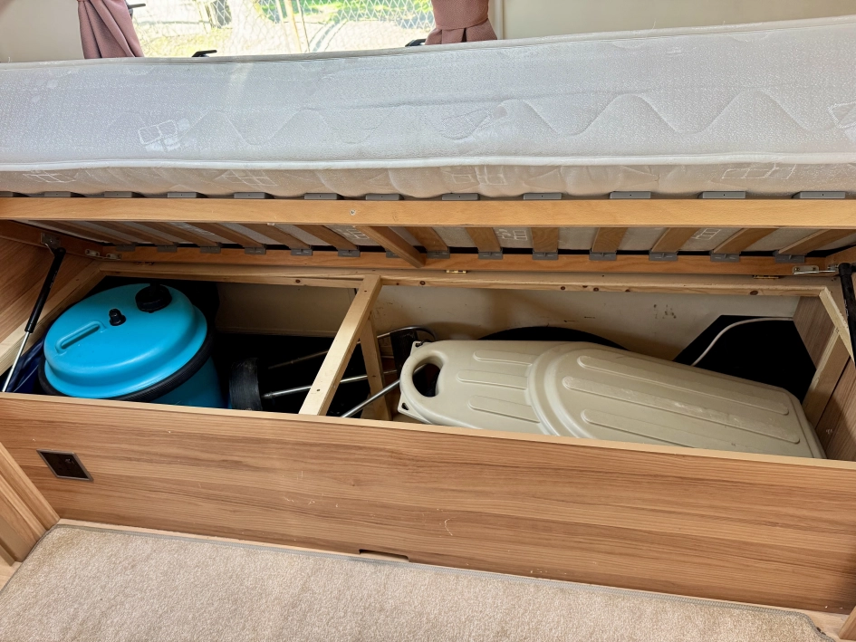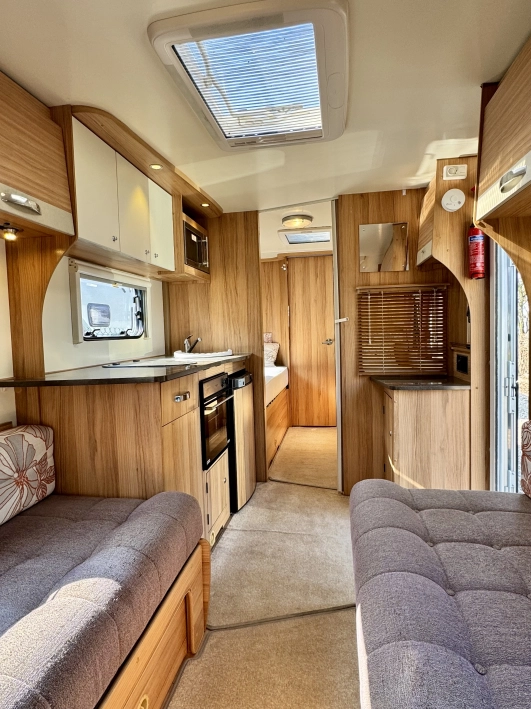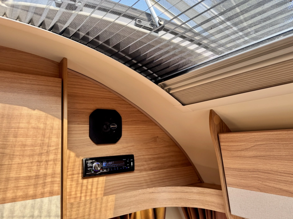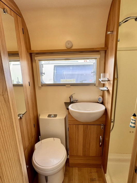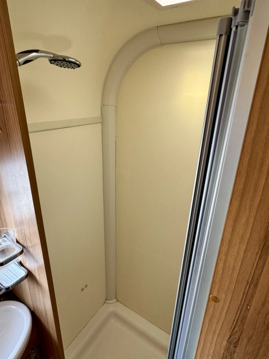 Komfortowe wnętrze z 4 miejscami do spania z dużą łazienką z zamykaną kabiną prysznicową oraz wc kasetą #Thetford.