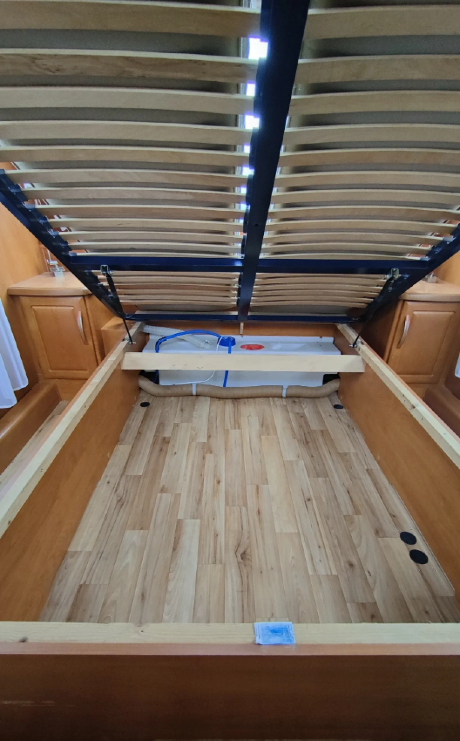 Zbiornik na wodę – 80L, zainstalowany pod dużym łóżkiem.