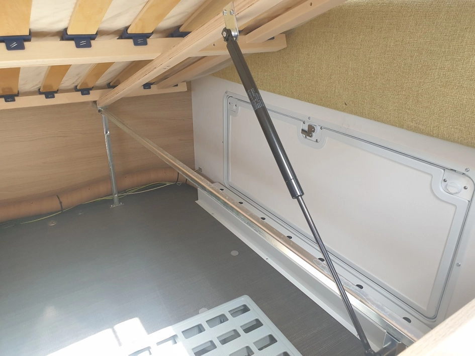 5 miejsc do spania, z czego 1 duże łóżko dwuosobowe z przodu przyczepy, łóżko piętrowe w tyle przyczepy, dodatkowe łóżko do spania w miejscu stolika - do rozłożenia, materac - wkładka w komplecie