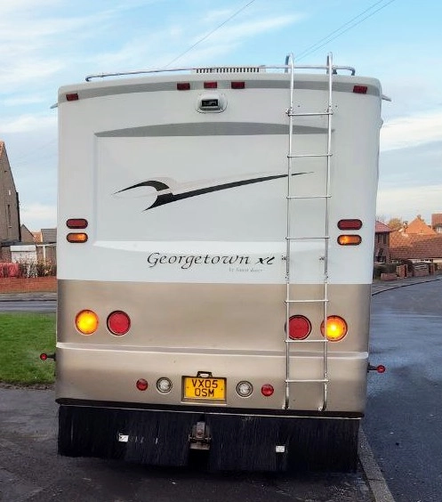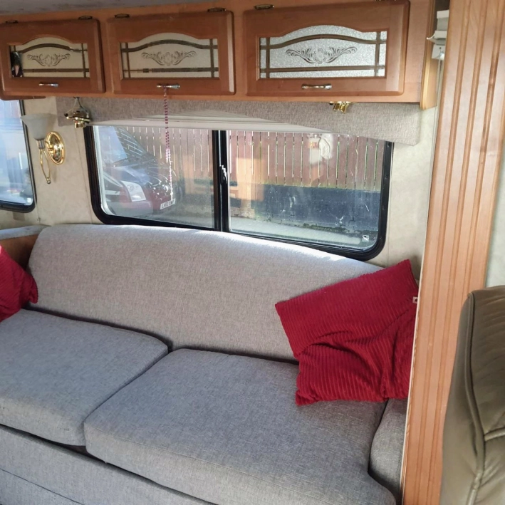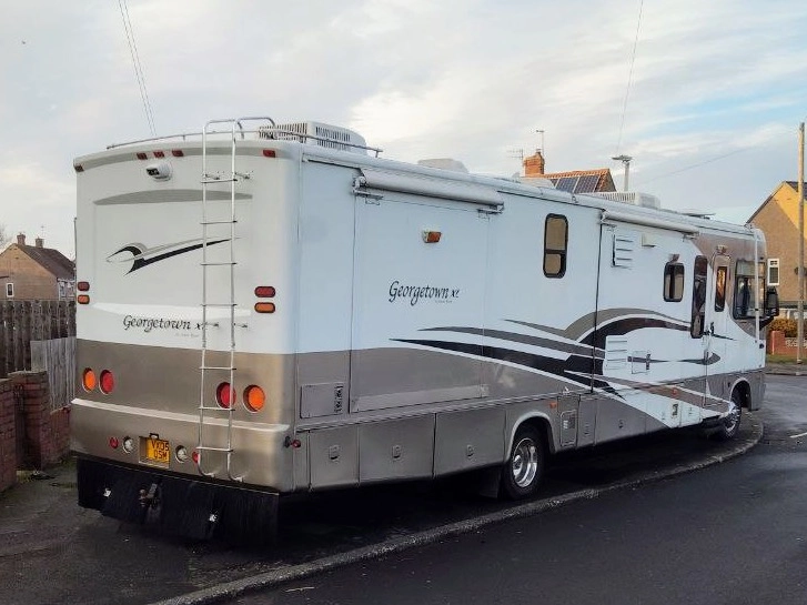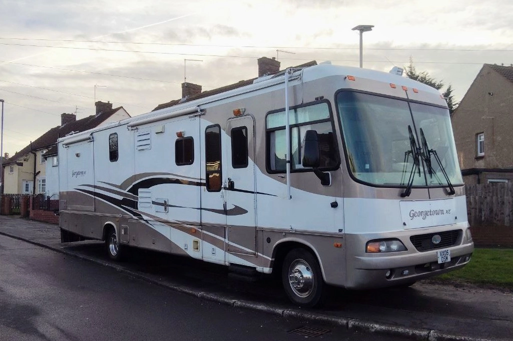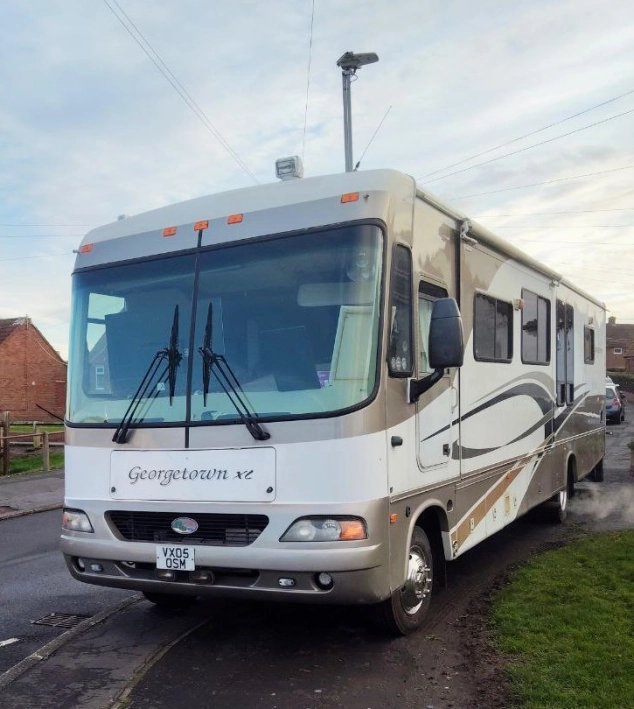 Duży samochód kempingowy Ford Georgetown XL 375 z 2005 roku, z dużą przestrzenią mieszkalną, z trzema wysuwanymi ścianami. Wyposażony jest w kuchnie, lodówkę, mikrofalówkę, łazienkę,, pralkę, sypialnię z lozkiem, salon. Miejsce do spania dla 6 osób.