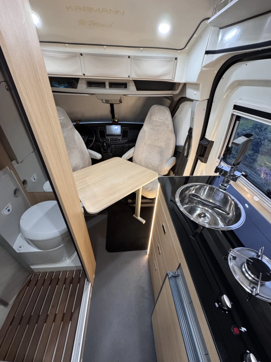 Oryginalna zabudowa firmy Karmann - model Dexter 570. Dwa miejsca do jazdy, dwa do spania - 2 pełnowymiarowe łóżka 90x200 połączone, ale na osobnych materacach i ramie w tzw. systemie niemieckim.