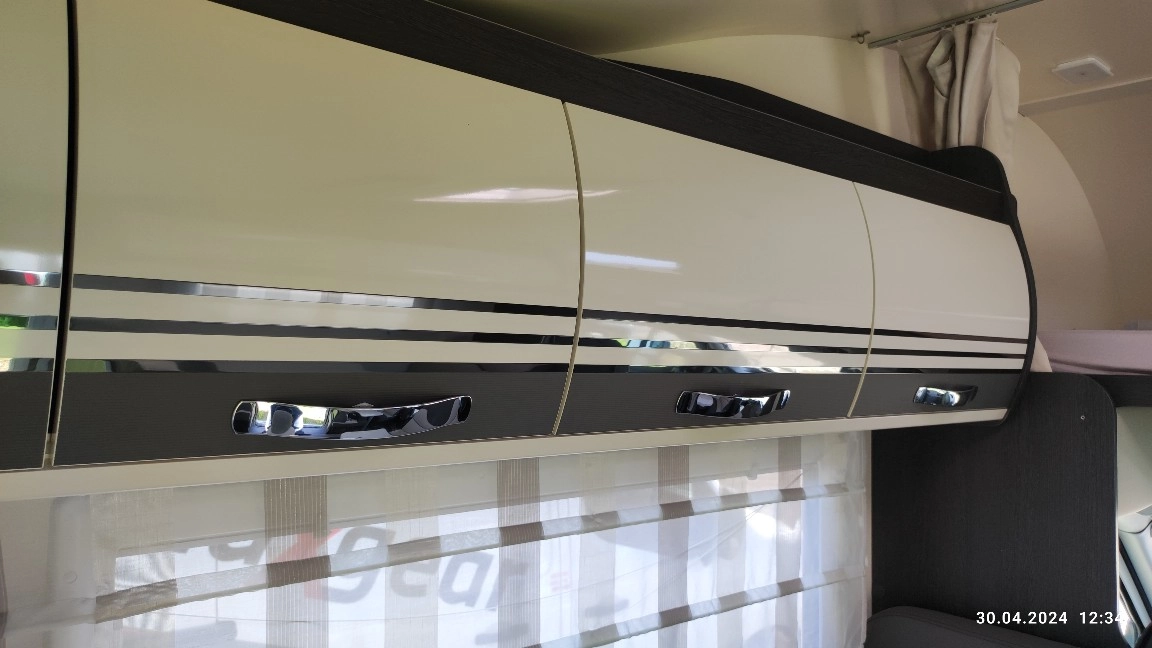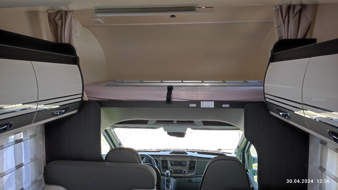 Zabudowa typu Alkowa, duże podwójne łóżko nad kabiną, 2 łóżka pojedyncze w tyle pojazdu, łóżko 2-osobowe rozkładane, łóżko 1-osobowe rozkładane. 2 stoliki składane,