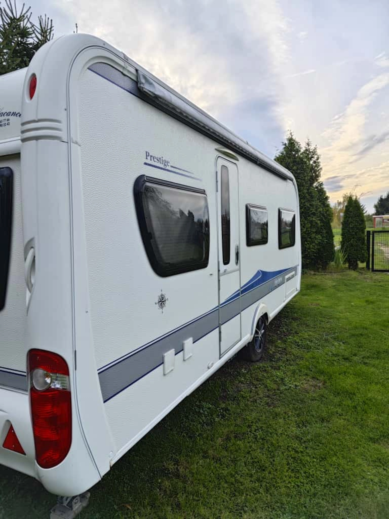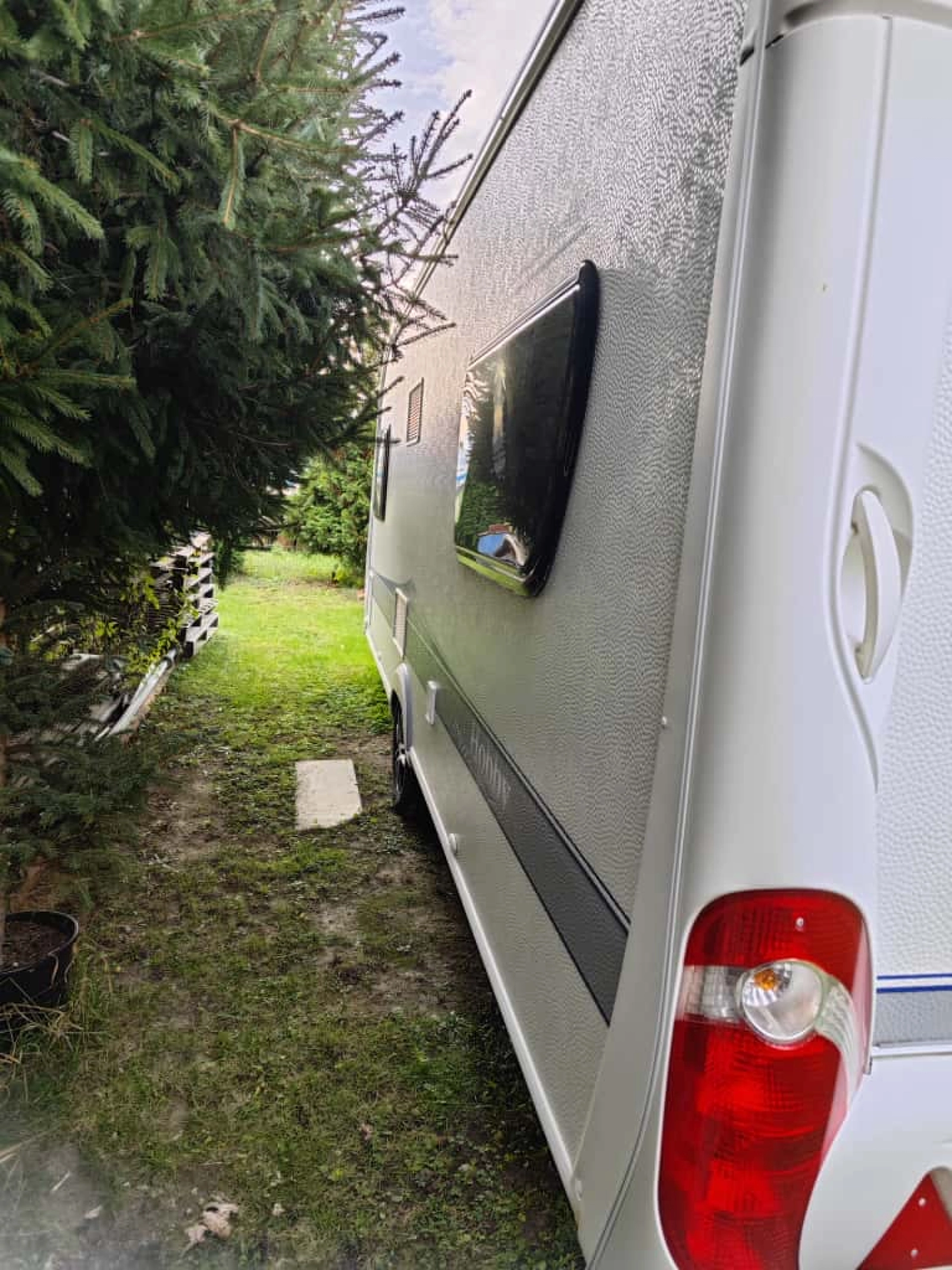 Przyczepa posiada również mover, dzięki któremu manewrowanie nią nie sprawia żadnego problemu. Z zewnątrz prezentuje się bardzo dobrze – lakier jest błyszczący, bez uszkodzeń czy oznak korozji, a wszystkie okna i uszczelki są w świetnym stanie. Do przyczepy dołączam komplet dokumentów i przeglądów, a także aktualne OC i AC. Jest w pełni gotowa do sezonu, bez konieczności dodatkowych nakładów.