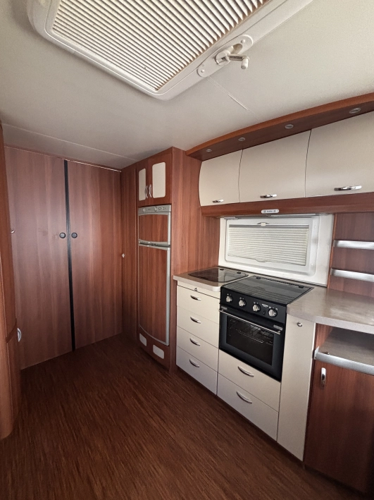 Układ WLU: Przestronny salon z narożną kanapą, wyposażona kuchnia (duża lodówka, zamrażarka ,piekarnik) oraz tylna łazienka przez całą szerokość przyczepy.