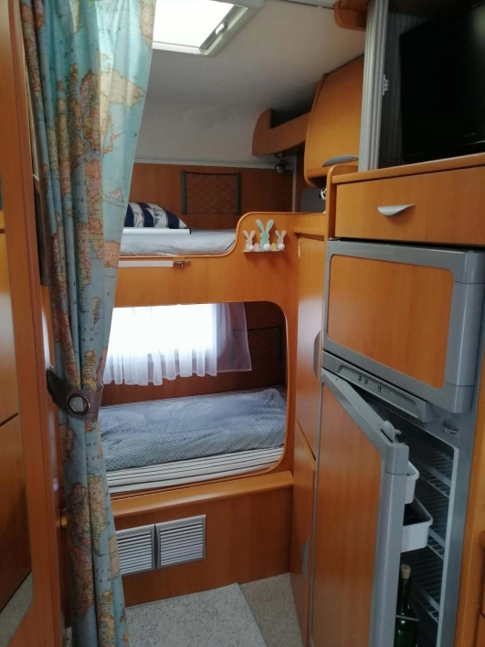 Z tyłu dwa oddzielne łóżka pojedyncze (dolne i górne, poprzeczne)