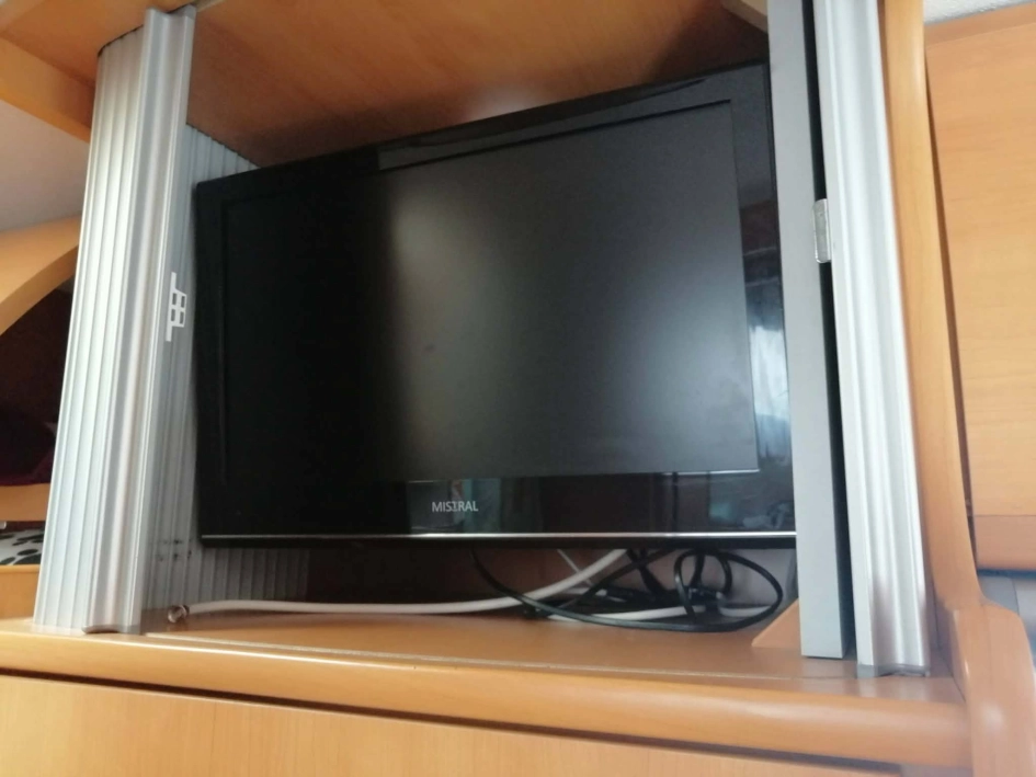 Telewizor nad lodówką (schowany za żaluzją)