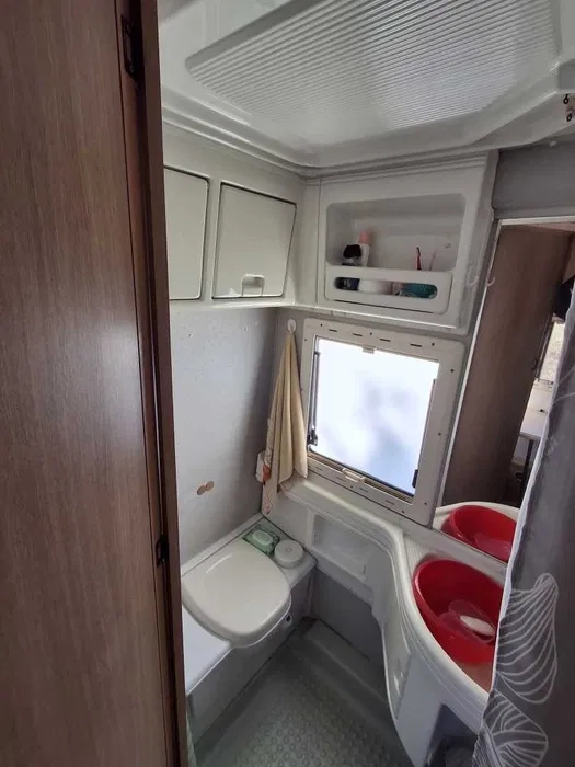W łazience jest standardowa toaleta kasetowa opróżniana z zewnątrz, umywalka z wyciąganym prysznicem, brodzik i sporo szafek.