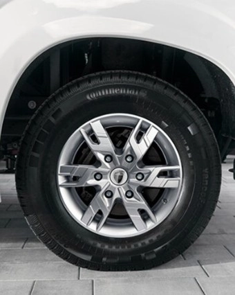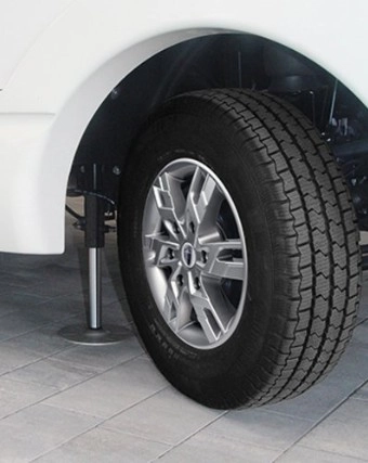 Aluminiowe felgi MORELO na przedniej osi z poszerzonym rozstawem kół oraz stalowe felgi z kołpakami na tylnej osi