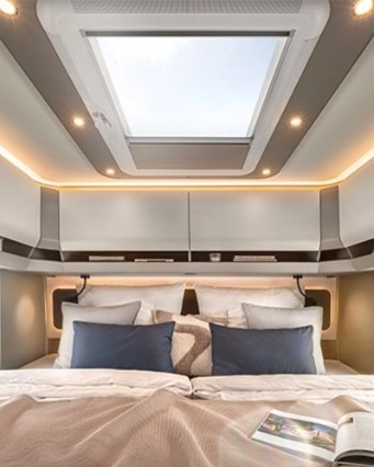 Klimatyzacja dachowa w łazience lub w korytarzu między prysznicem a łazienką. Pilot na podczerwień (wysokość pojazdu + 150 mm), zasilanie tylko z sieci.