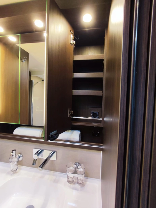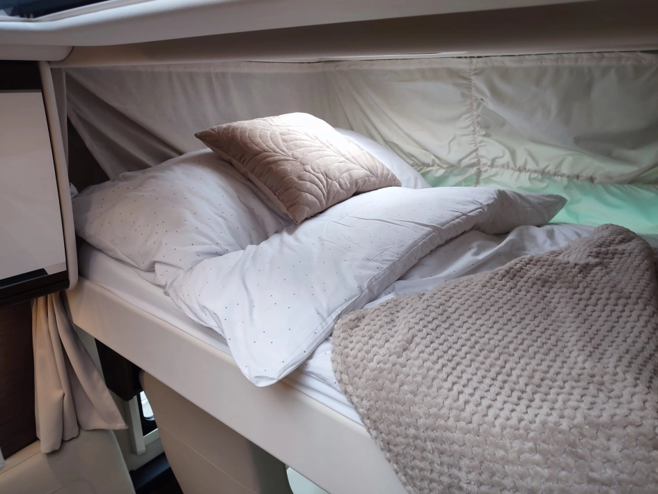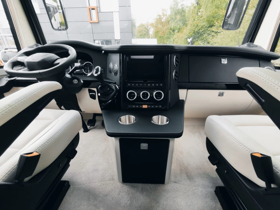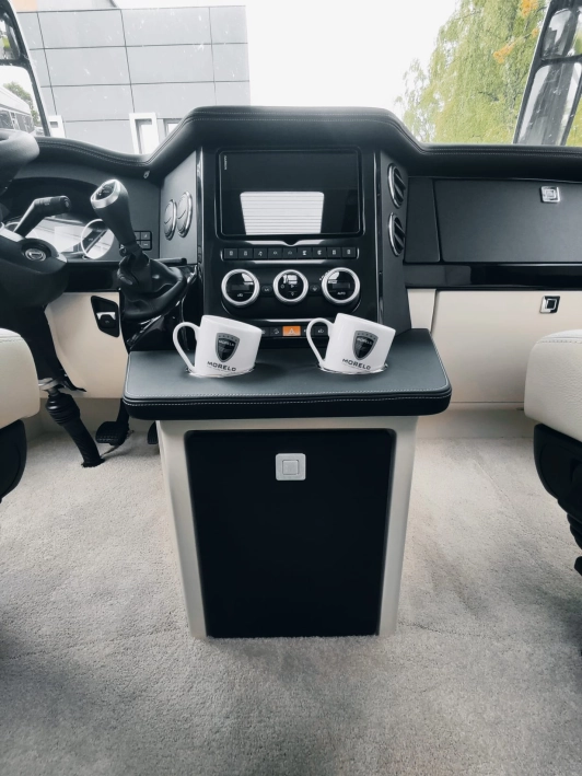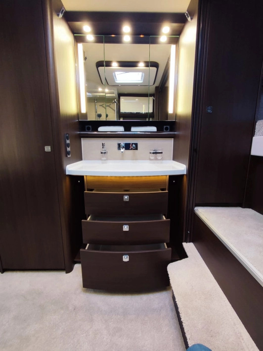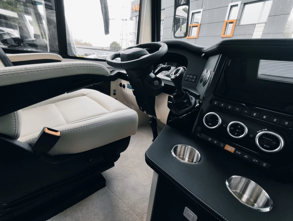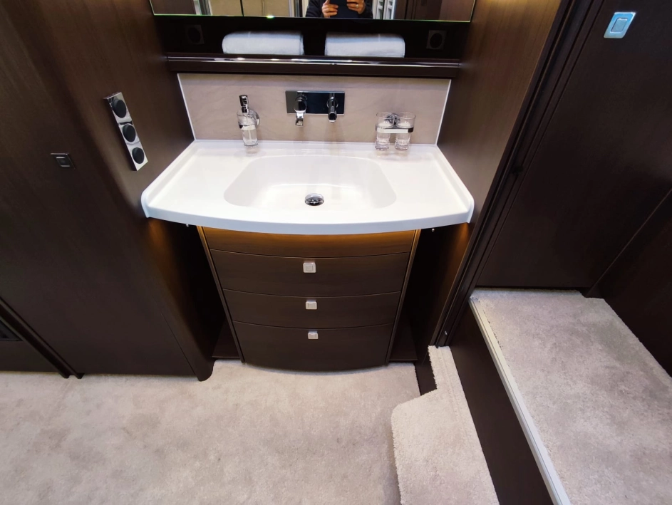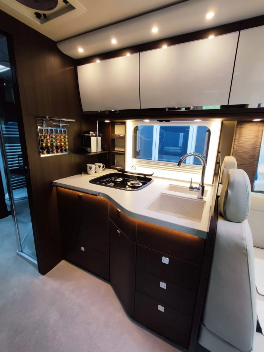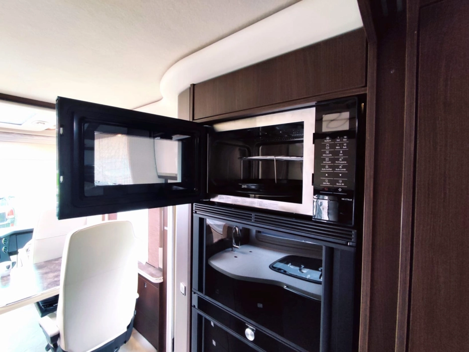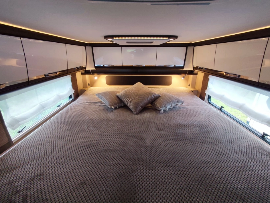 Na pokładzie oprócz lodówki, zamrażarki, kuchenki gazowej nie zabraknie takich udogodnień jak kuchenka mikrofalowa, zmywarka do naczyń, odkurzacz bezprzewodowy, klimatyzacja postojowa, antena satelitarna, ekspres do kawy, TV 40” w salonie oraz 27” w sypialni, przetwornica 12V/230V o mocy 3000W, a także elektrycznie wysuwana markiza o długości 6 metrów.