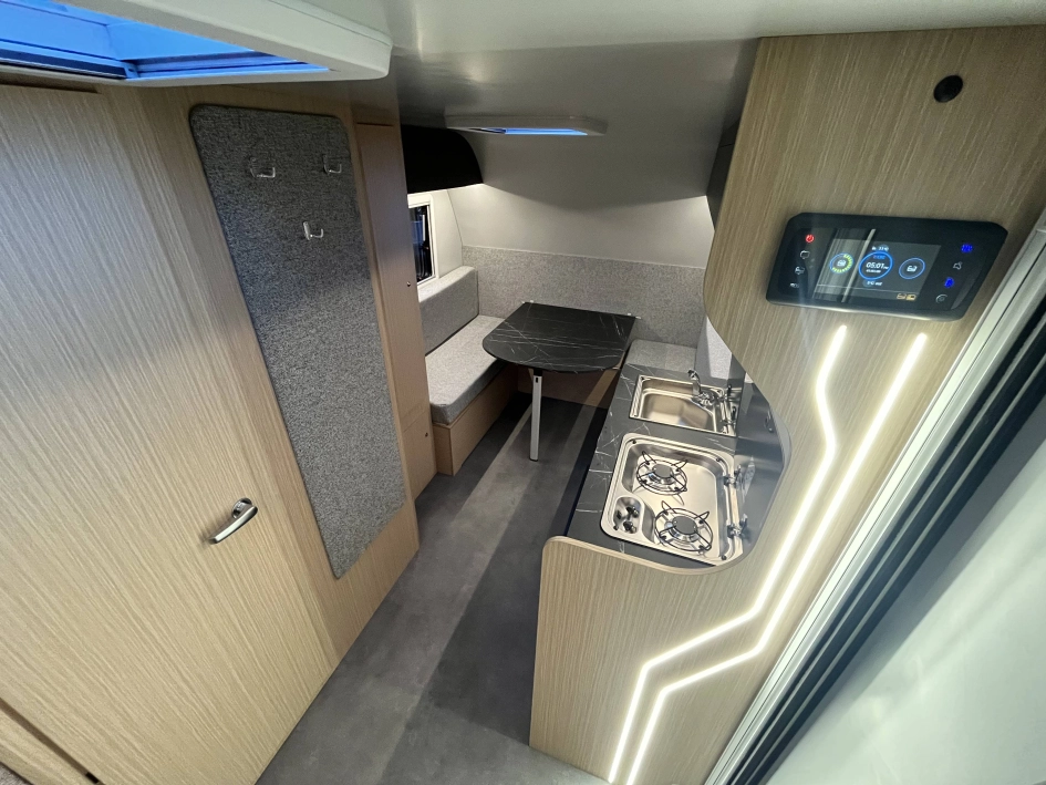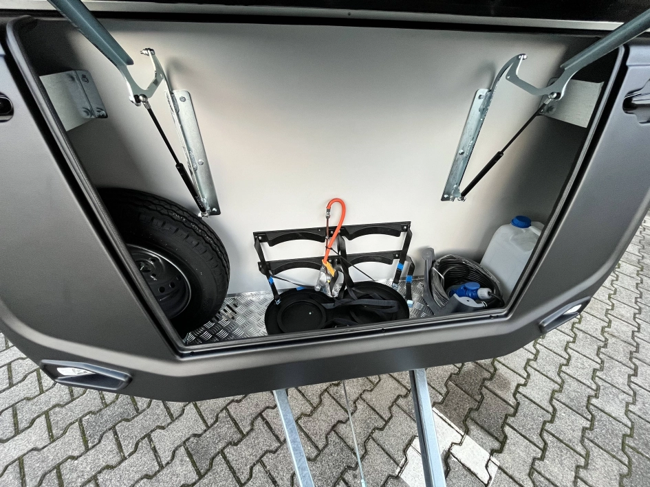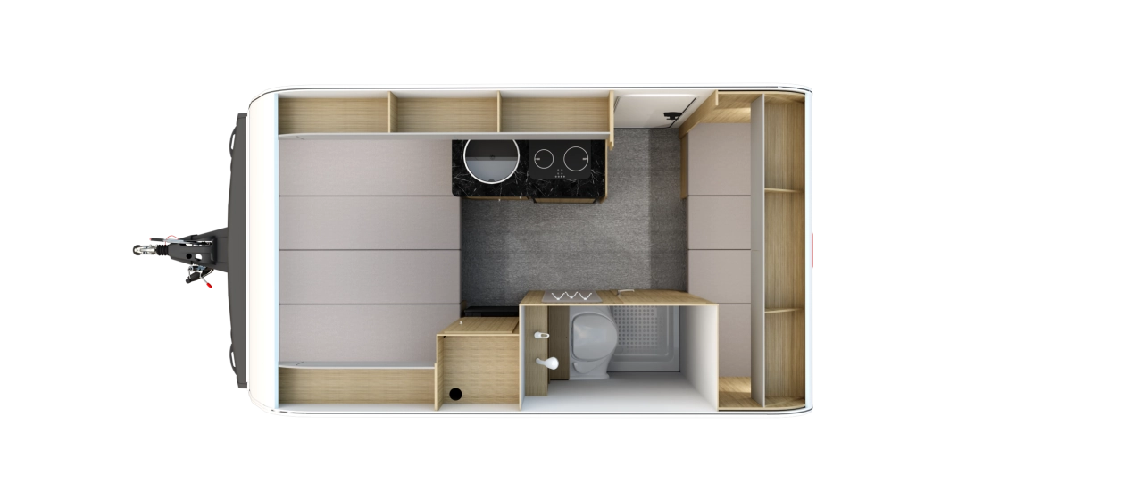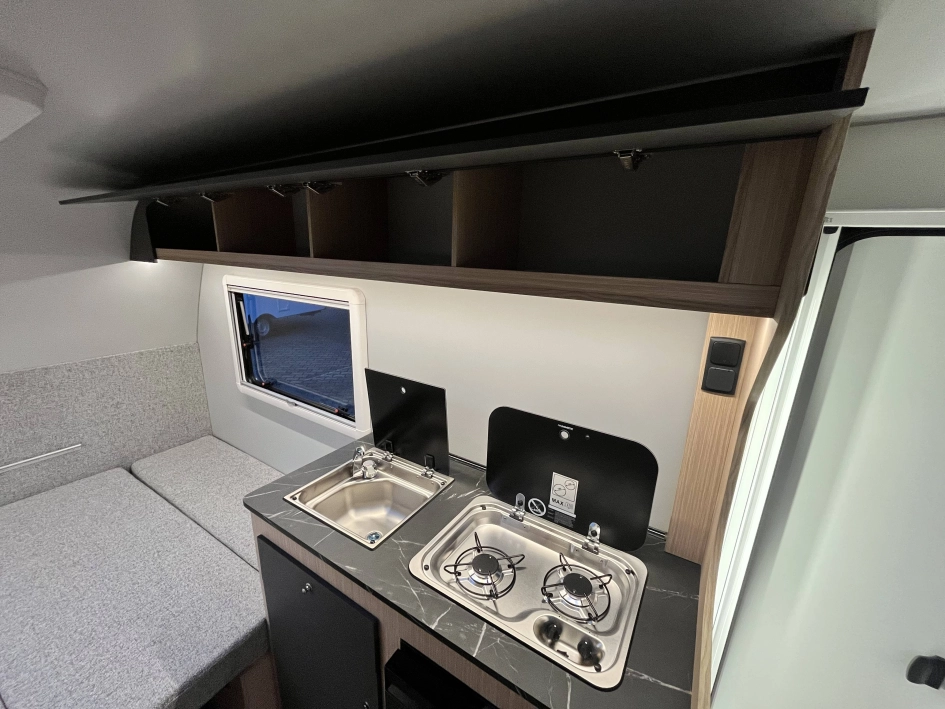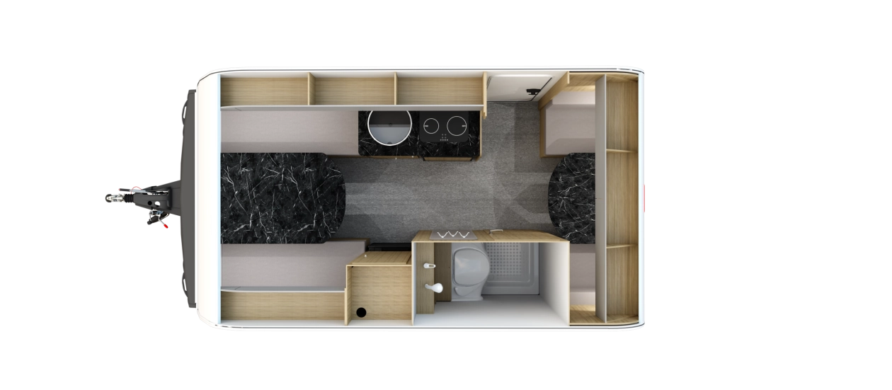 W części dziennej znajduje się funkcjonalny stół, który z łatwością można przekształcić w wygodne, dwuosobowe łóżko. W tylnej części umieszczono mniejszy stolik, który w razie potrzeby może pełnić funkcję pojedynczego miejsca noclegowego. Dla par to doskonałe rozwiązanie — pozostawienie jednego z miejsc w formie użytkowej daje dodatkową przestrzeń do spożywania posiłków czy pracy, bez konieczności codziennego składania łóżka. Wysoki komfort użytkowania zapewnia bogate wyposażenie standardowe. Przyczepa została wyposażona w łazienkę z toaletą, prysznicem, termą elektryczną oraz brodzikiem, a także w aneks kuchenny z kuchnią gazową, lodówką i zlewozmywakiem — wszystko, czego potrzeba do wygodnego podróżowania i codziennego funkcjonowania. W najnowszych modelach zastosowaliśmy nowoczesny, dotykowy panel sterowania, który umożliwia intuicyjne zarządzanie wszystkimi głównymi funkcjami przyczepy. Z jego poziomu można wygodnie sterować oświetleniem, kontrolować poziom czystej wody w zbiorniku (30l) czy sprawdzać stan naładowania akumulatora — wszystko to za pomocą czytelnego, nowoczesnego interfejsu. Dodatkowym atutem jest szeroki wybór opcji wyposażenia dodatkowego, dzięki którym każdy klient może dostosować przyczepę do swoich indywidualnych potrzeb i stylu podróżowania. Wersja BLACK – zewnętrzne elementy wykonane z czarnego tworzywa (bakista, pas tylny, nadkola, owiewki, drzwi kasety toaletowej, przyłącza) oraz płyta sandwich w kolorze szarym (na zewnątrz i w środku)