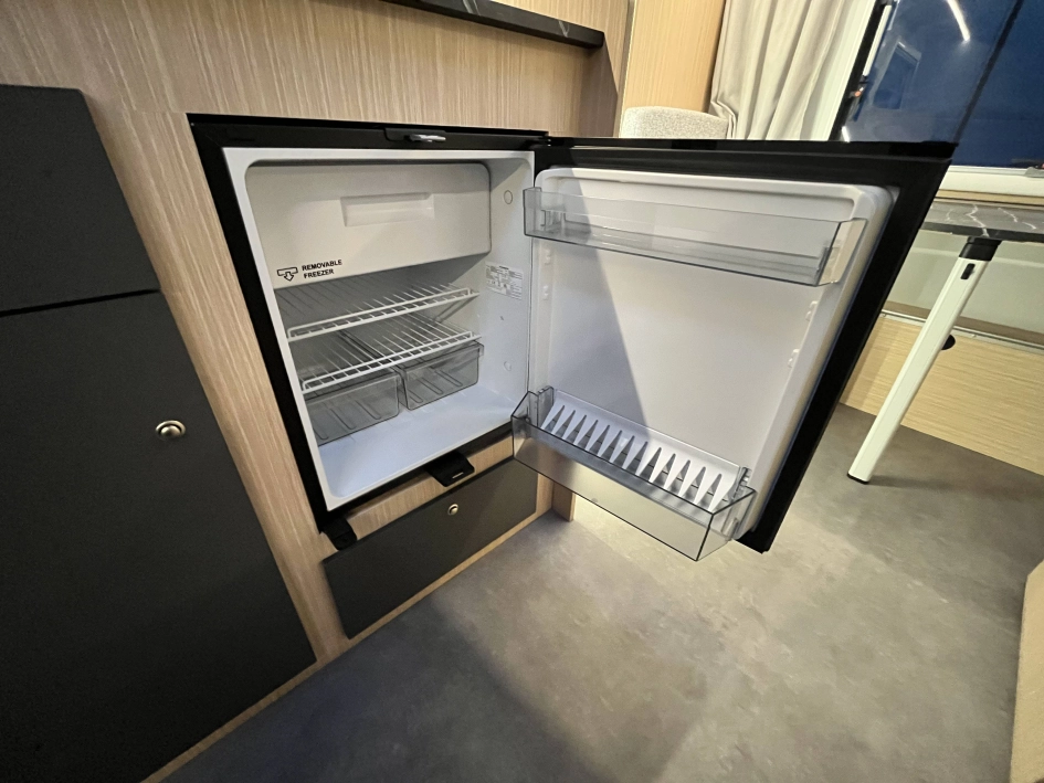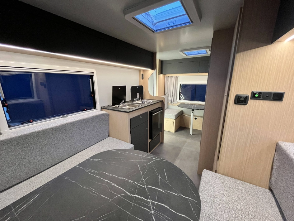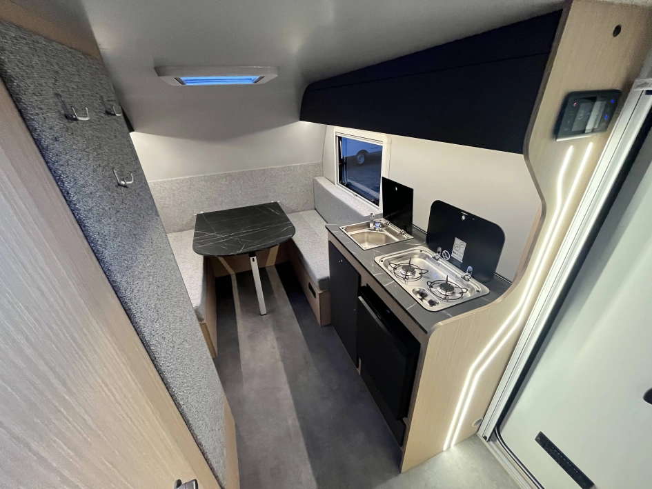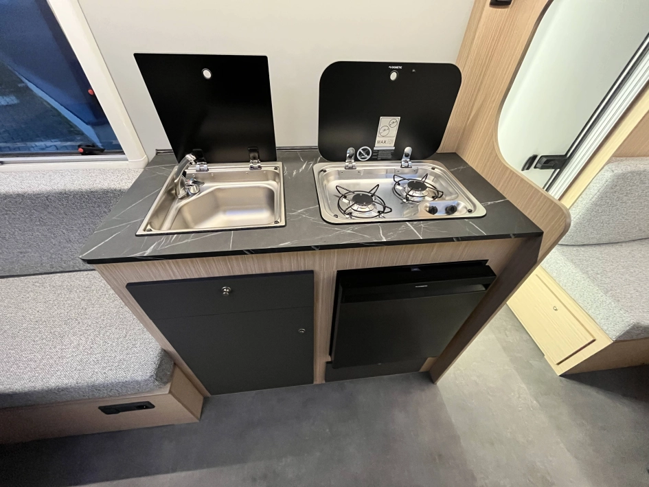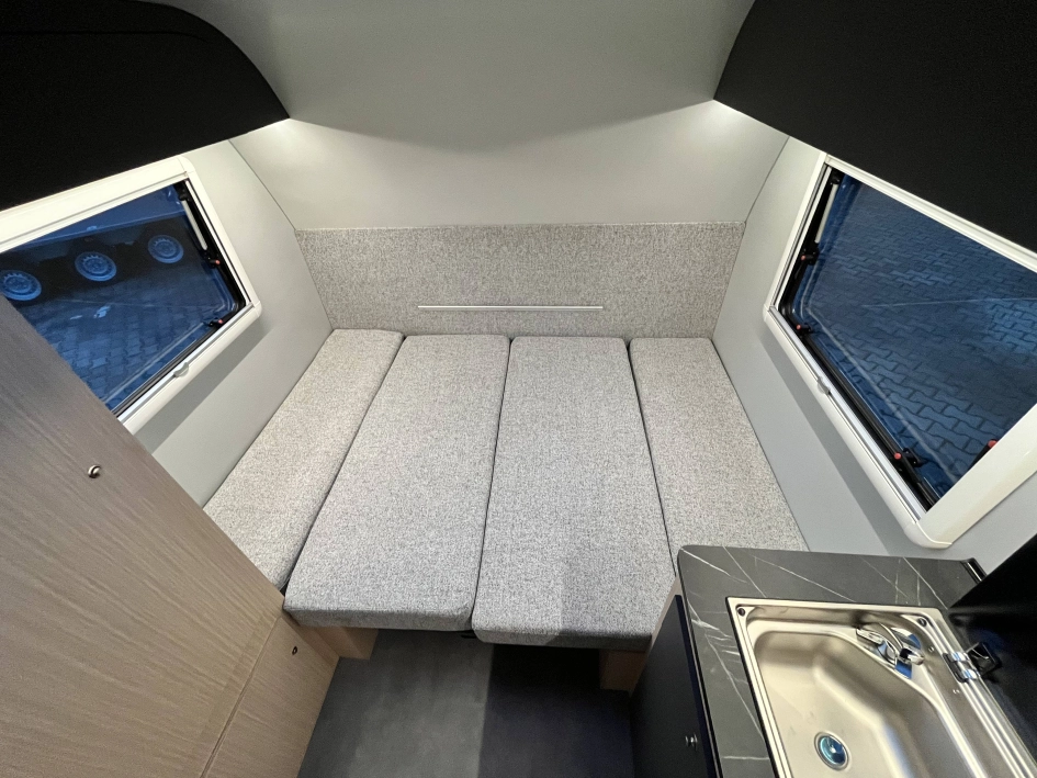 W części dziennej znajduje się funkcjonalny stół, który z łatwością można przekształcić w wygodne, dwuosobowe łóżko. W tylnej części umieszczono mniejszy stolik, który w razie potrzeby może pełnić funkcję pojedynczego miejsca noclegowego. Dla par to doskonałe rozwiązanie — pozostawienie jednego z miejsc w formie użytkowej daje dodatkową przestrzeń do spożywania posiłków czy pracy, bez konieczności codziennego składania łóżka. Wysoki komfort użytkowania zapewnia bogate wyposażenie standardowe. Przyczepa została wyposażona w łazienkę z toaletą, prysznicem, termą elektryczną oraz brodzikiem, a także w aneks kuchenny z kuchnią gazową, lodówką i zlewozmywakiem — wszystko, czego potrzeba do wygodnego podróżowania i codziennego funkcjonowania. W najnowszych modelach zastosowaliśmy nowoczesny, dotykowy panel sterowania, który umożliwia intuicyjne zarządzanie wszystkimi głównymi funkcjami przyczepy. Z jego poziomu można wygodnie sterować oświetleniem, kontrolować poziom czystej wody w zbiorniku (30l) czy sprawdzać stan naładowania akumulatora — wszystko to za pomocą czytelnego, nowoczesnego interfejsu. Dodatkowym atutem jest szeroki wybór opcji wyposażenia dodatkowego, dzięki którym każdy klient może dostosować przyczepę do swoich indywidualnych potrzeb i stylu podróżowania. Wersja BLACK – zewnętrzne elementy wykonane z czarnego tworzywa (bakista, pas tylny, nadkola, owiewki, drzwi kasety toaletowej, przyłącza) oraz płyta sandwich w kolorze szarym (na zewnątrz i w środku)