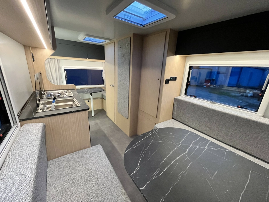 Nowy N-Cross BLACK 2026 3 osobowy - Nowoczesna przyczepa kempingowa dla trzyosobowej rodziny – idealna również dla par. Ten duży model przyczepy kempingowej naszej produkcji został wykonany z izolowanych płyt typu sandwich, które zapewniają doskonałą izolację termiczną oraz solidną konstrukcję. Jej przestronne i nowoczesne wnętrze zaprojektowano z myślą o komforcie trzyosobowej rodziny, ale przyczepa ta sprawdzi się również idealnie jako wygodna przestrzeń wypoczynkowa dla par.