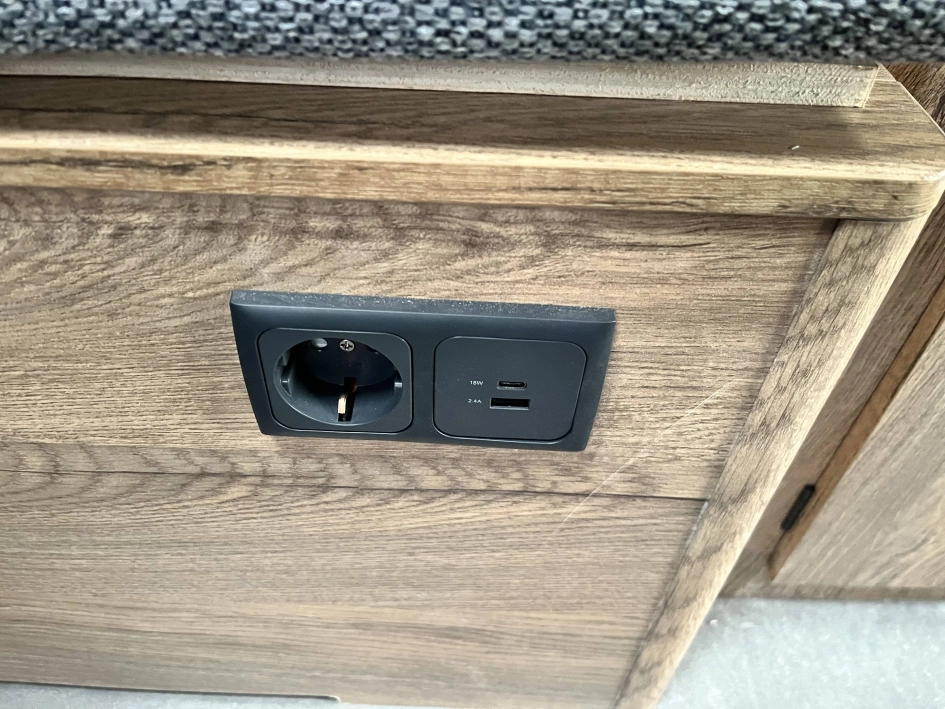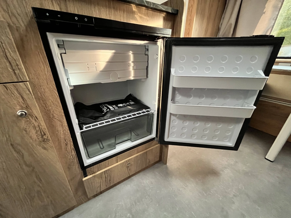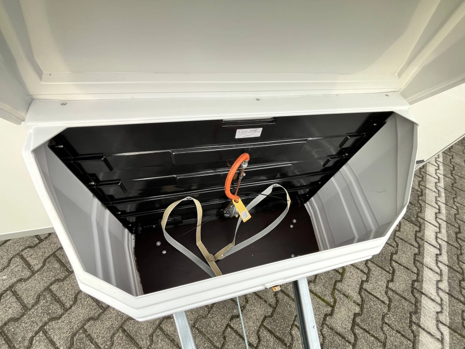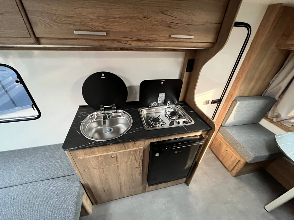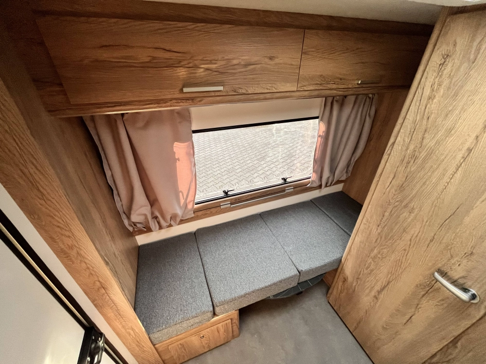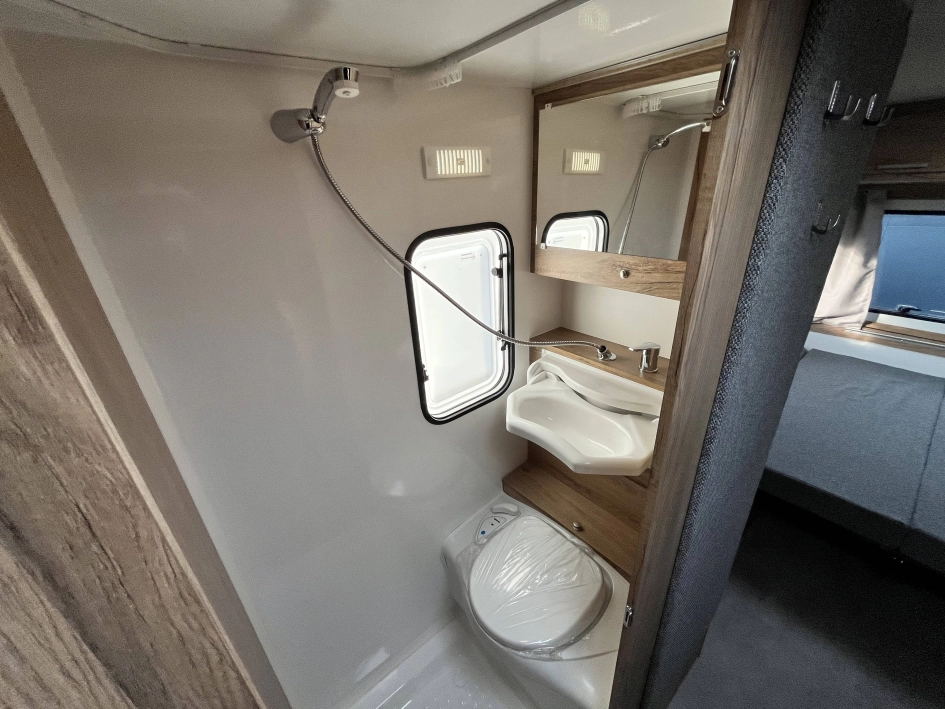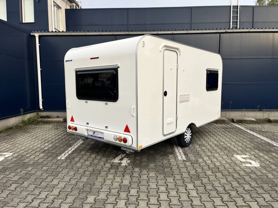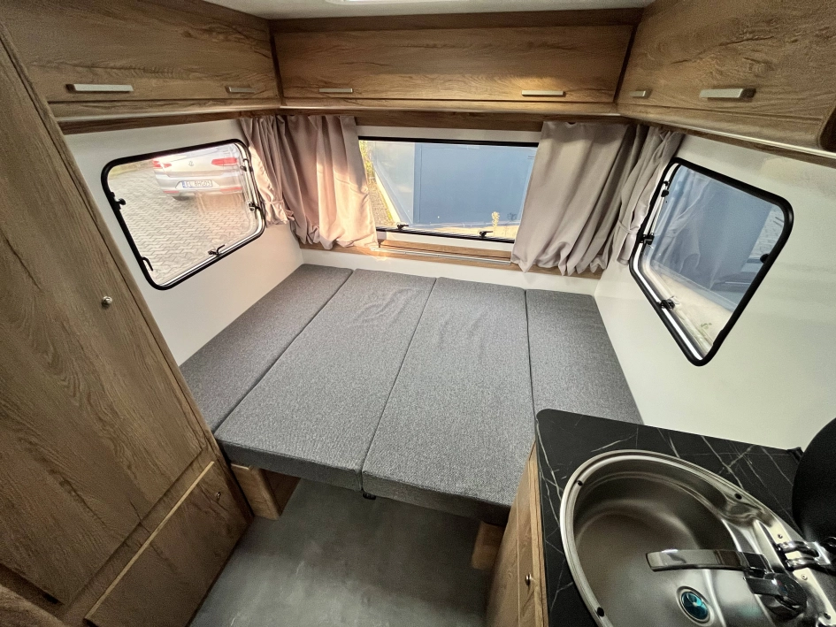 WYPOSAŻENIE STANDARDOWE zawarte w cenie katalogowej na rok modelowy 2025 obejmuje: oś hamowana, urządzenie najazdowe, koła z felgą stalową, 4 podpory stabilizujące, korba do podpór, nadwozie w kolorze białym, listwę fartucha, 2x wywietrzniki dachowe Dometic Mini Heki, lampa przedsionka LED, oświetlenie drogowe LED, trzecie światło STOP, meble ze sklejki, okna podwójne barwione (kolor do wyboru), zasłony w oknach (tkanina do wyboru wg wzornika), materace i oparcia (tkanina do wyboru wg wzornika), kuchnia gazowa i zlewozmywak, lodówka kompresorowa 57L, kasetę toaletową i prysznic z instalacją ciepłej wody (bojler elektryczny Truma TT2), brodzik, oświetlenie wewnętrzne LED, gniazdko 230V, gniazdo USB, zasilacz 12v, akumulator AGM 95Ah, zbiornik wody 30l, stopień wejściowy Fiamma, kabel przyłączeniowy 25m, dwa małe okna (700x300), łóżko piętrowe (stałe)