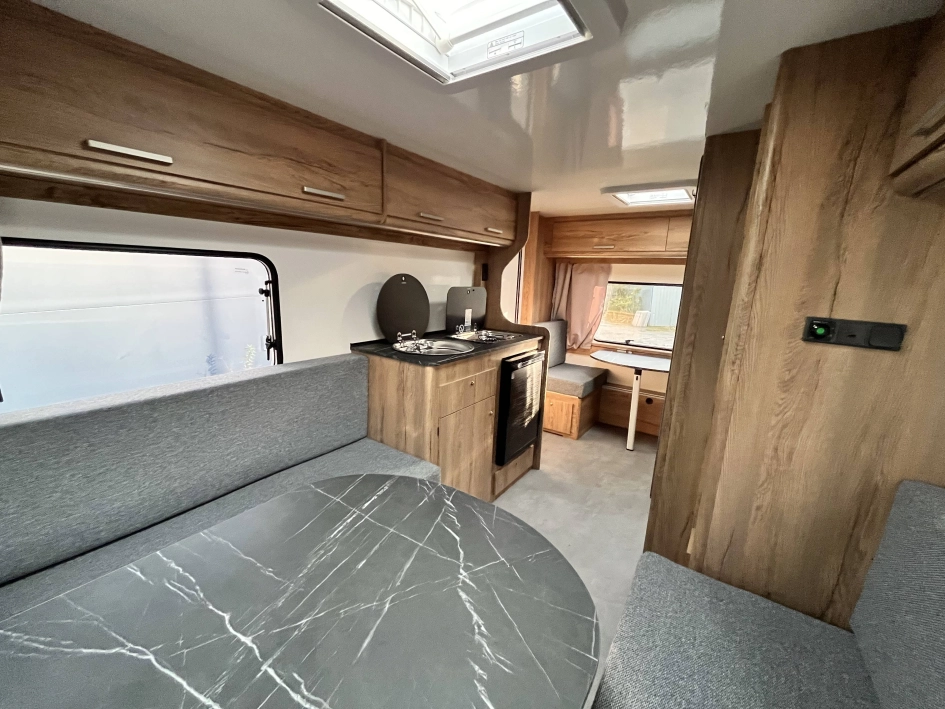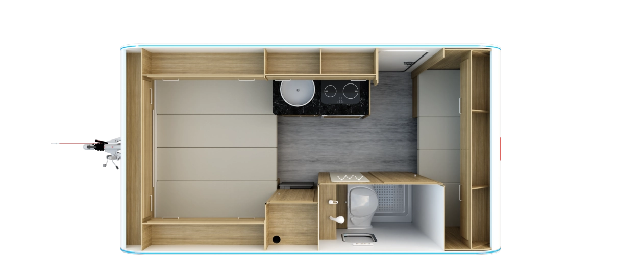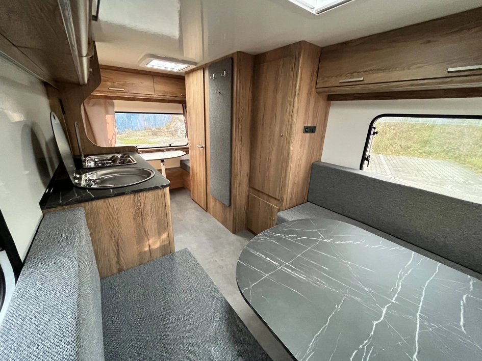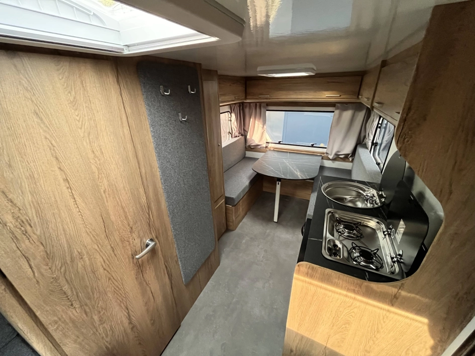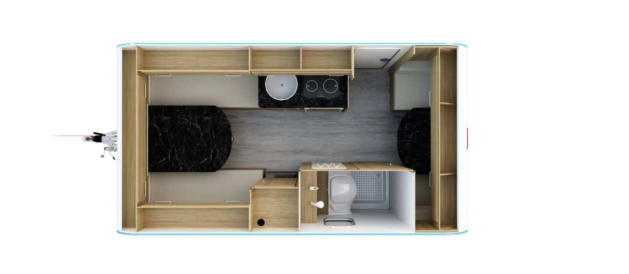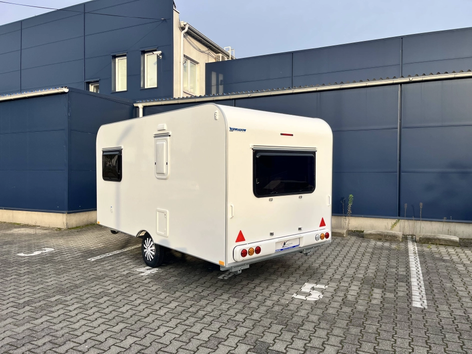 N-LAZUR 3 - Najnowsza seria lekkich przyczep kempingowych Lazur – idealne połączenie funkcjonalności, przestronności i przystępnej ceny. Ten duży model przyczepy kempingowej naszej produkcji został wykonany z izolowanych płyt typu sandwich, które zapewniają doskonałą izolację termiczną oraz solidną konstrukcję. Jej przestronne i nowoczesne wnętrze zaprojektowano z myślą o komforcie trzyosobowej rodziny, ale przyczepa ta sprawdzi się również idealnie jako wygodna przestrzeń wypoczynkowa dla par. W części dziennej znajduje się funkcjonalny stół, który z łatwością można przekształcić w wygodne, dwuosobowe łóżko. W tylnej części umieszczono mniejszy stolik, który w razie potrzeby może pełnić funkcję pojedynczego miejsca noclegowego. Dla par to doskonałe rozwiązanie — pozostawienie jednego z miejsc w formie użytkowej daje dodatkową przestrzeń do spożywania posiłków czy pracy, bez konieczności codziennego składania łóżka. Wysoki komfort użytkowania zapewnia bogate wyposażenie standardowe. Przyczepa została wyposażona w łazienkę z toaletą, prysznicem, termą elektryczną oraz brodzikiem, a także w aneks kuchenny z kuchnią gazową, lodówką i zlewozmywakiem — wszystko, czego potrzeba do wygodnego podróżowania i codziennego funkcjonowania. Dodatkowym atutem jest szeroki wybór opcji wyposażenia dodatkowego, dzięki którym każdy klient może dostosować przyczepę do swoich indywidualnych potrzeb i stylu podróżowania.