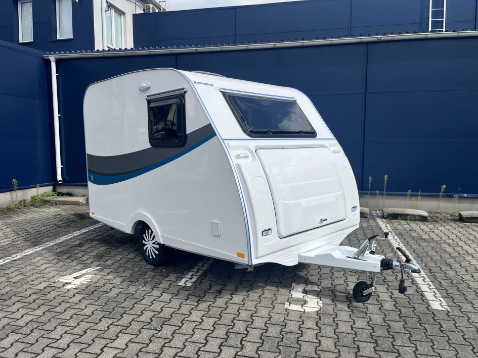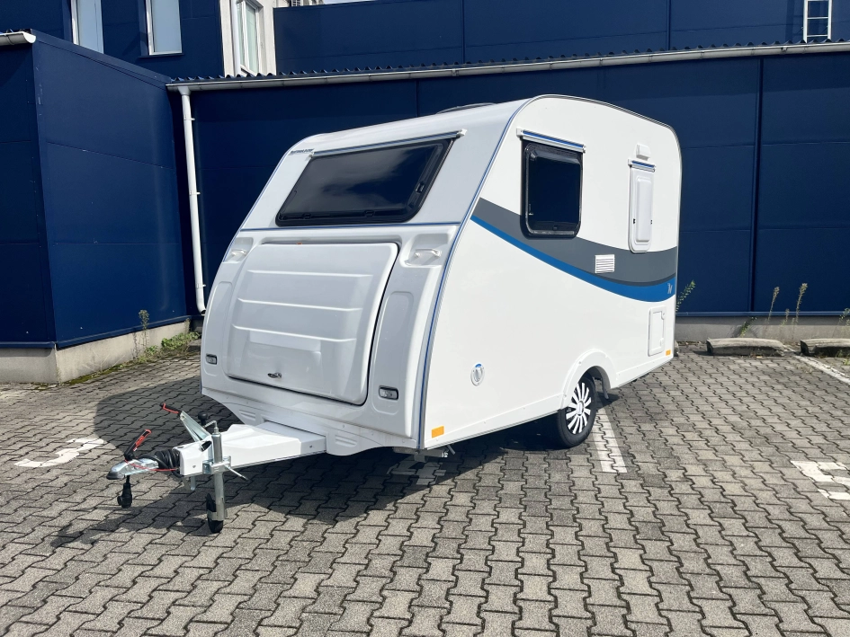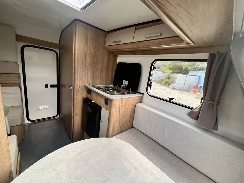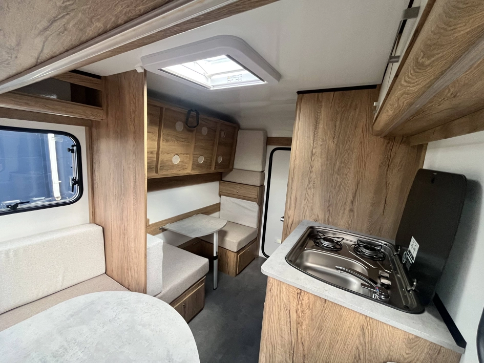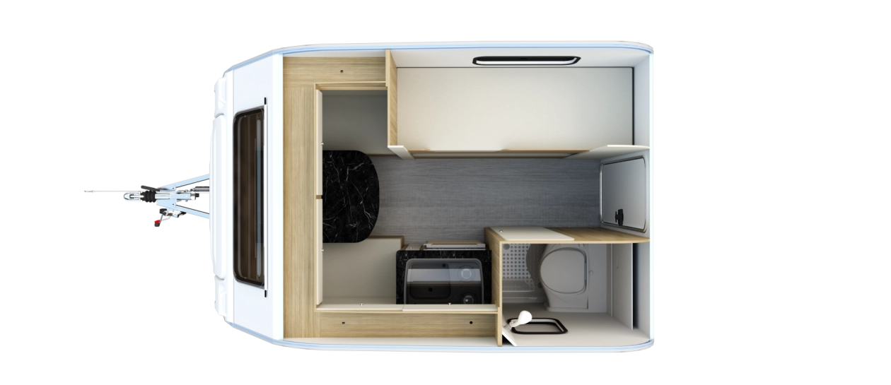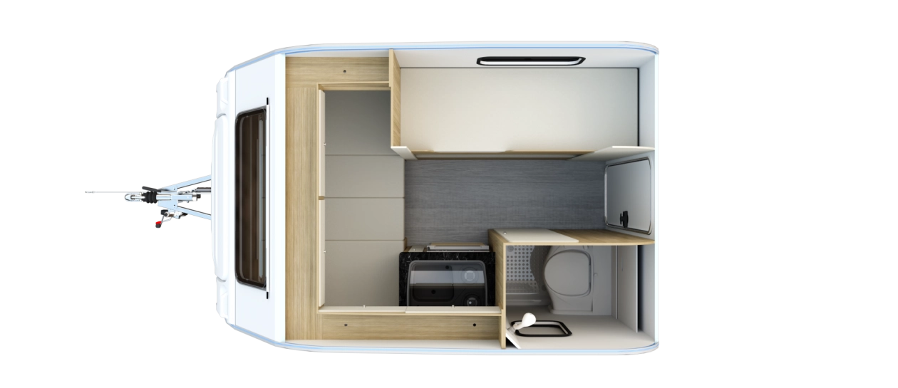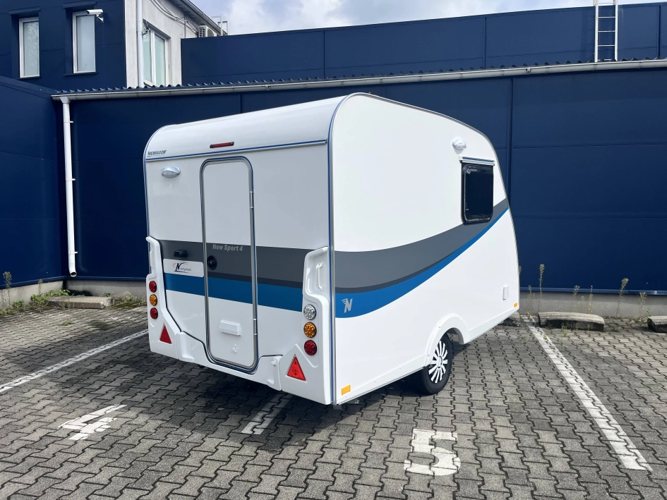 New Sport 4 - Pierwszy model przyczepy kempingowej naszej produkcji z drzwiami wejściowymi z tyłu, mieszczący czteroosobową rodzinę. W przedniej części przyczepy znajduje się stół, zamieniający się w rozkładane łóżko o wymiarach 118×190, po boku łóżko piętrowe o wymiarach materacy 65×170 cm . W wersji 2025 górne łóżko piętrowe jest podnoszone, a dolne można przekształcić w stolik z dwoma siedziskami. W standardowym wyposażeniu przyczepy znajdziemy aneks kuchenny DOMETIC HSG2445 składający się z dwupalnikowej kuchni gazowej w połączeniu z jednokomorowym zlewem oraz 57 litrowej kompresorowej lodówki Dometic. Na wyposażeniu toalety znajdziemy kasetę toaletową oraz prysznic z termą i brodzikiem.