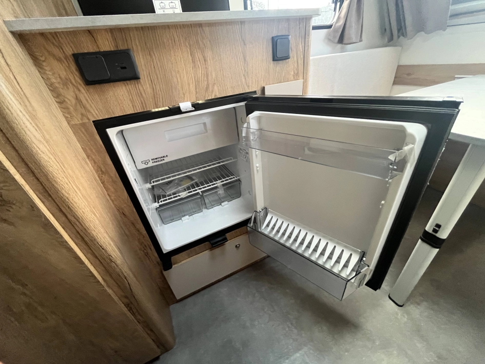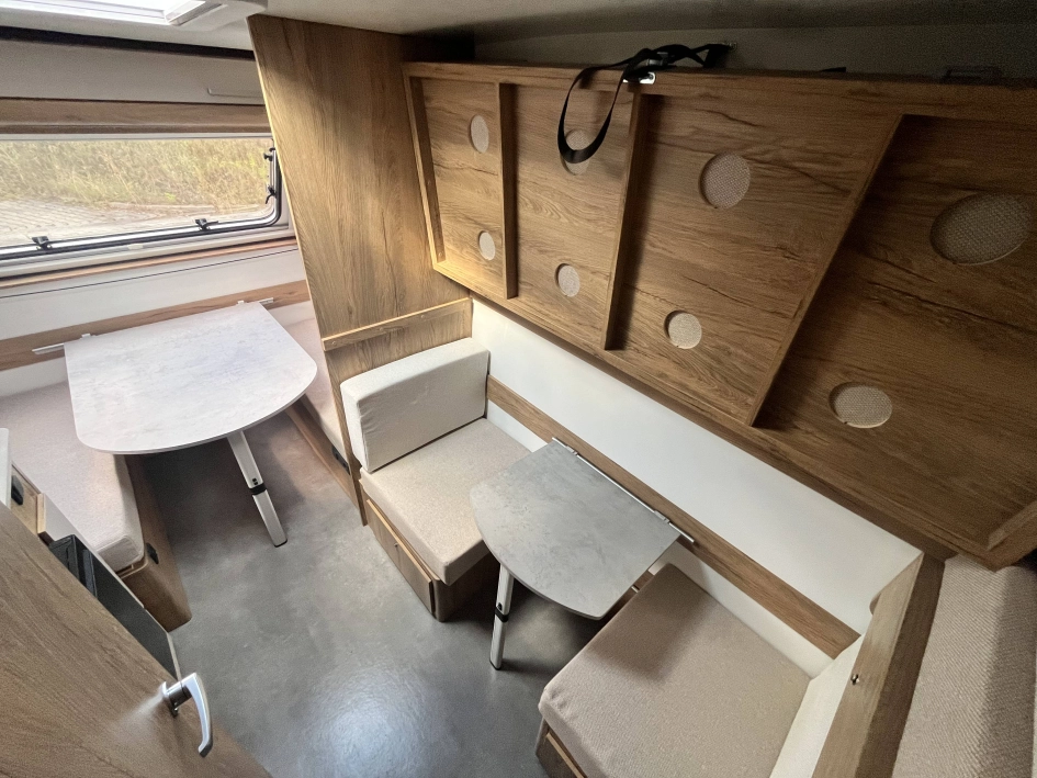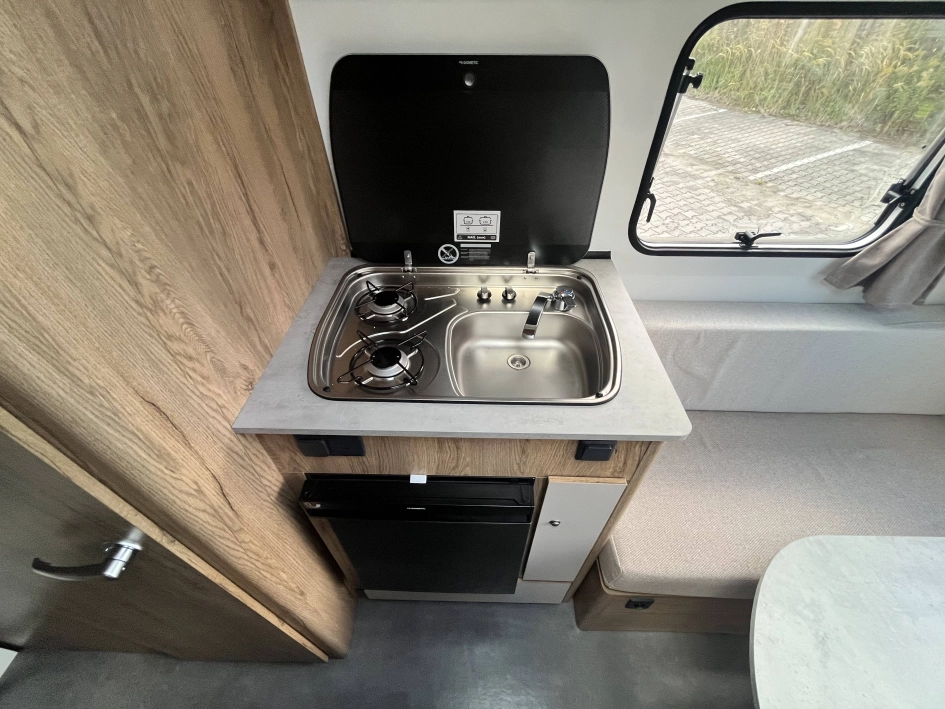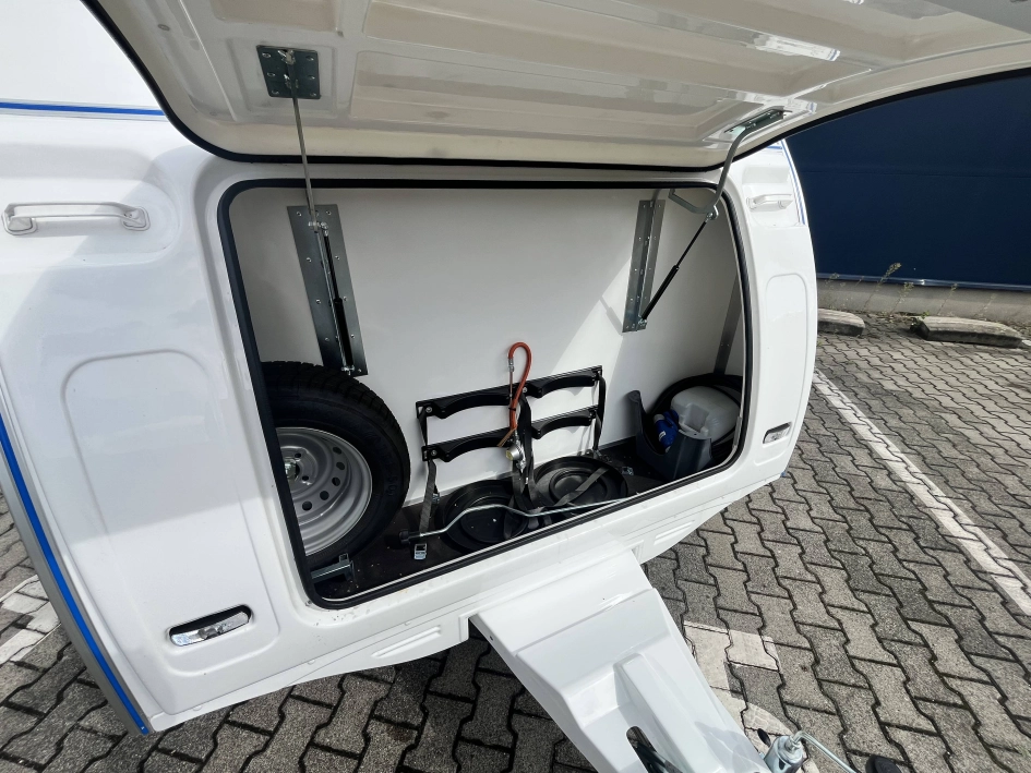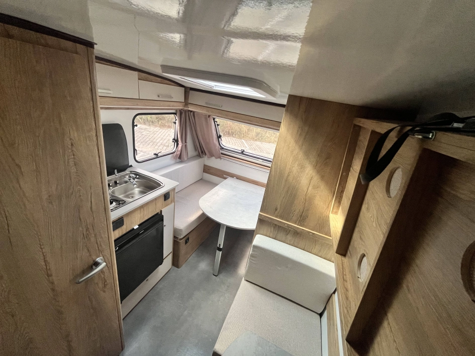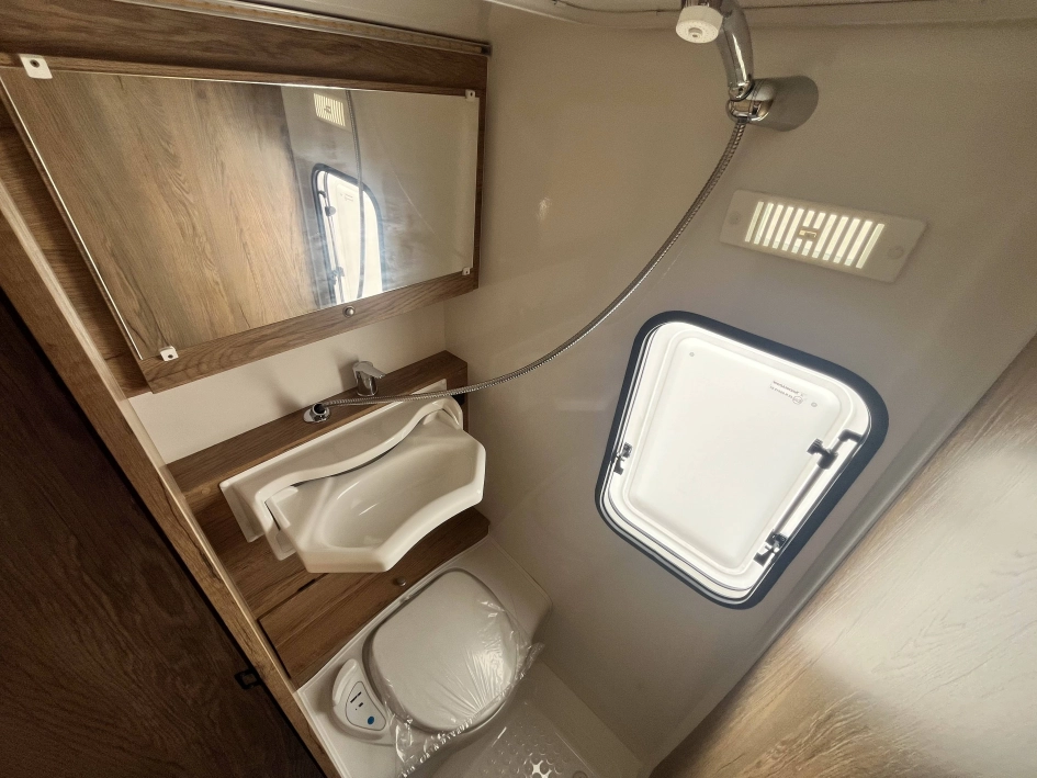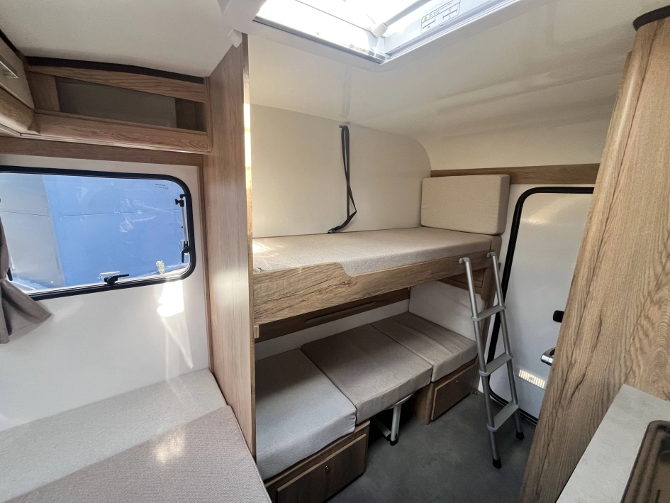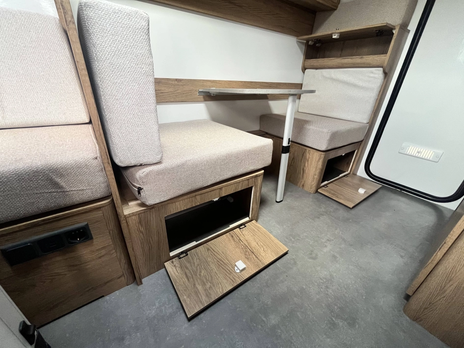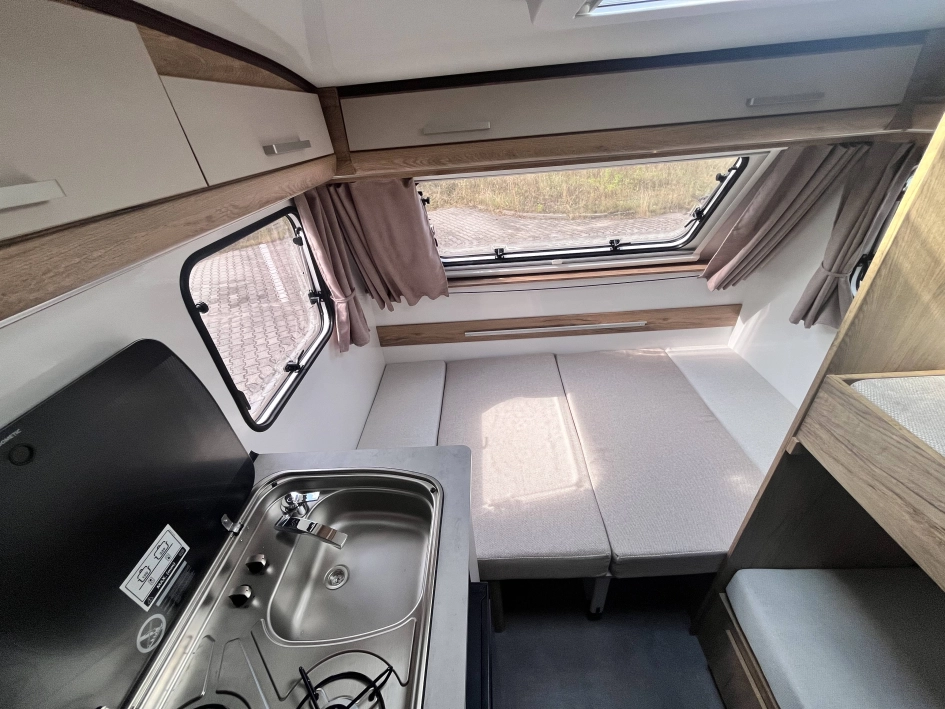 WYPOSAŻENIE STANDARDOWE zawarte w cenie katalogowej na rok modelowy 2025 obejmuje: oś hamowaną, urządzenie najazdowe, koło podporowe, koła z felgą stalową, 4 podpory stabilizujące, korba do podpór, nadwozie w kolorze białym, listwę fartucha, okleina, osłona urządzenia najazdowego (zakrycie dyszla), wywietrznik dachowy Mini Heki, lampa przedsionka LED, oświetlenie wewnętrzne LED, oświetlenie drogowe LED, trzecie światło STOP, meble ze sklejki, okna podwójne barwione (kolor do wyboru), zasłony w oknach (tkanina do wyboru wg wzornika), materace i oparcia (tkanina do wyboru wg wzornika), kuchnię gazową i zlewozmywak, lodówka kompresorowa 57L, kasetę toaletową i prysznic z instalacją ciepłej wody (boiler elektryczny Truma TT2), brodzik, oświetlenie wnętrza LED, gniazdko 230V, gniazdo USB, zasilacz 12v, akumulator AGM 95Ah, zbiornik wody 30L, stopień wejściowy Fiamma, kabel przyłączeniowy 25m, składane łóżko piętrowe