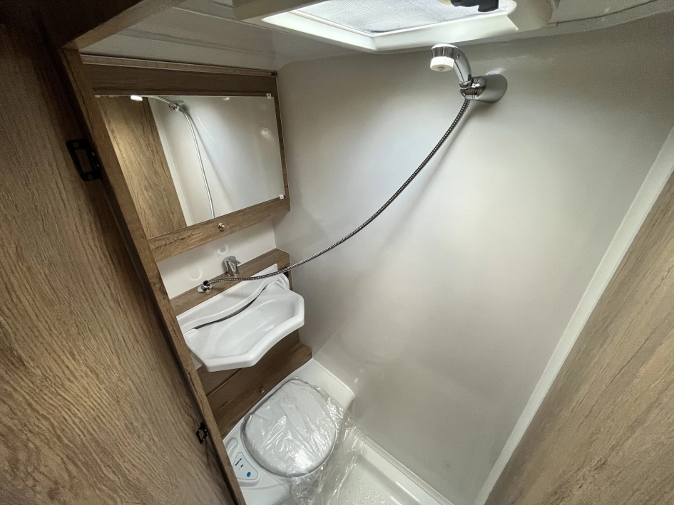 WYPOSAŻENIE STANDARDOWE zawarte w cenie katalogowej na rok modelowy 2025 obejmuje: oś hamowaną, urządzenie najazdowe, koła z felgą stalową, 4 podpory stabilizujące, korba do podpór, nadwozie w kolorze białym, listwę fartucha, wywietrznik dachowy Mini Heki, lampa przedsionka LED, oświetlenie drogowe LED, trzecie światło STOP, meble ze sklejki, okna podwójne barwione (kolor do wyboru), zasłony w oknach (tkanina do wyboru wg wzornika), materace i oparcia (tkanina do wyboru wg wzornika), kuchnię gazową i zlewozmywak, lodówka kompresorowa 57L, kasetę toaletową i prysznic z instalacją ciepłej wody (bojler elektryczny Truma TT2), brodzik, oświetlenie wewnętrzne LED, gniazdko 230V, gniazdo USB, zasilacz 12v, akumulator AGM 95Ah, zbiornik wody 30L., stopień wejściowy Fiamma, kabel przyłączeniowy 25m