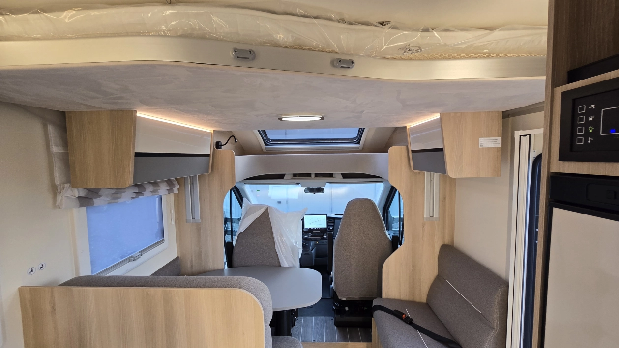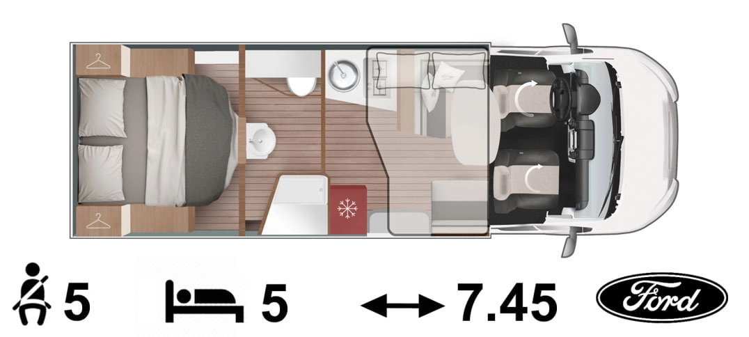 Półintegra – długość: 7,45 m. 5 miejsc do jazdy i 5 miejsc do spania