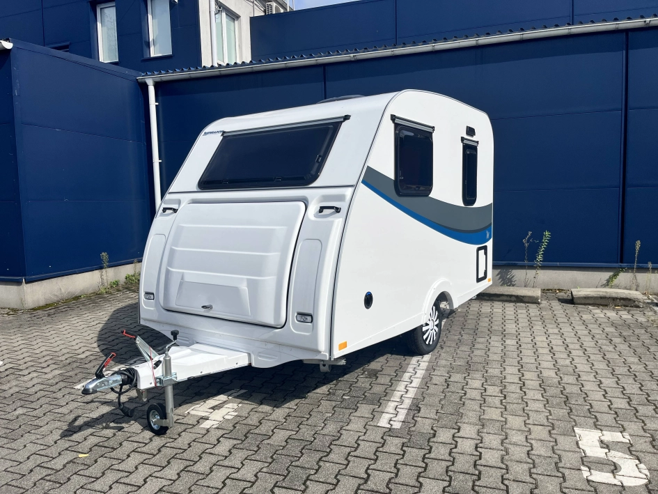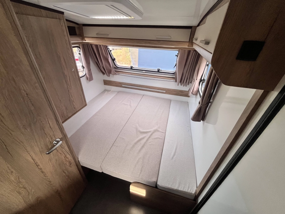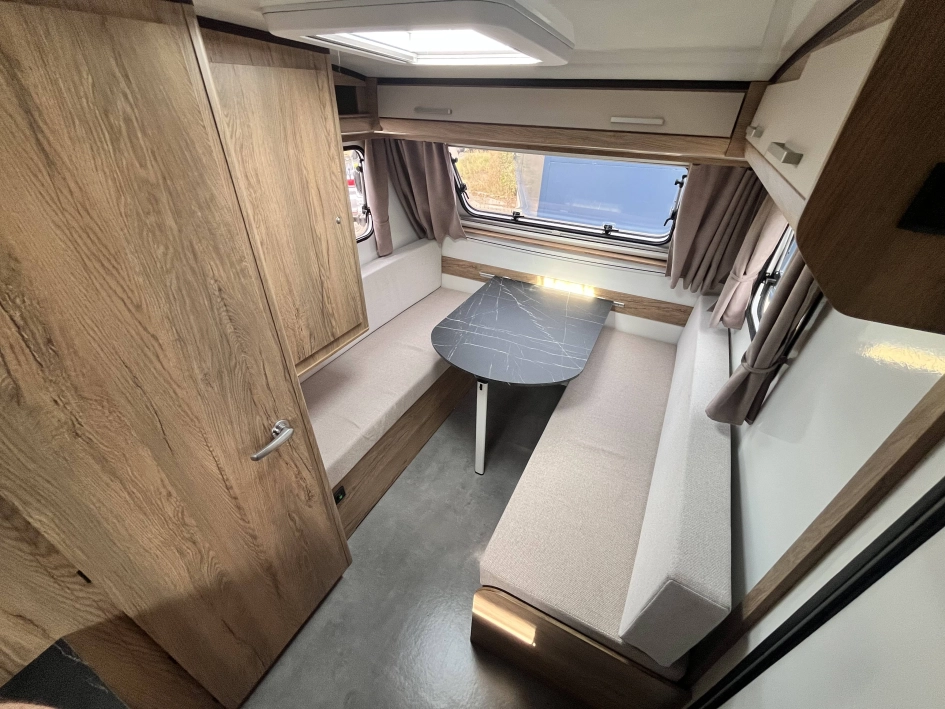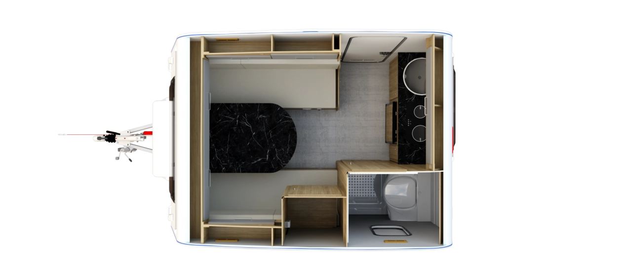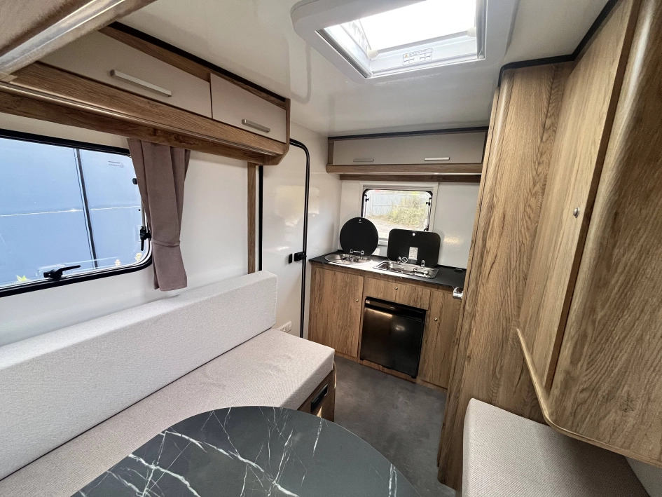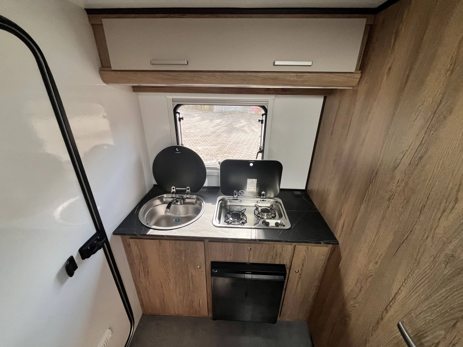 WYPOSAŻENIE STANDARDOWE zawarte w cenie katalogowej na rok modelowy 2025 obejmuje: oś hamowaną, urządzenie najazdowe, koło podporowe, koła z felgą stalową, 4 podpory stabilizujące, korba do podpór, nadwozie w kolorze białym, listwę fartucha, okleina, osłona urządzenia najazdowego (zakrycie dyszla), wywietrznik dachowy Mini Heki, lampa przedsionka LED, oświetlenie wewnętrzne LED, oświetlenie drogowe LED, trzecie światło STOP, meble ze sklejki, okna podwójne barwione (kolor do wyboru), zasłony w oknach (tkanina do wyboru wg wzornika), materace i oparcia (tkanina do wyboru wg wzornika), kuchnię gazową i zlewozmywak, lodówka kompresorowa 57L, kasetę toaletową i prysznic z instalacją ciepłej wody (bojler elektryczny Truma TT2), brodzik, oświetlenie wnętrza LED, gniazdko 230V, gniazdo USB, zasilacz 12v, zbiornik wody 30L, stopień wejściowy Fiamma, kabel przyłączeniowy 25m