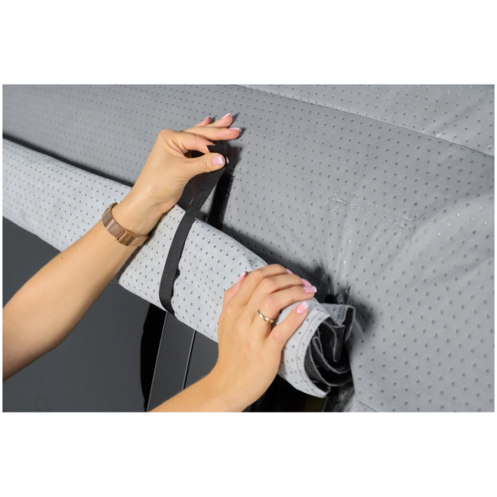 - Regulowane pasy, elastyczne krawędzie i zamki błyskawiczne ułatwiają dopasowanie pokrowca i zabezpieczają go przed wiatrem.